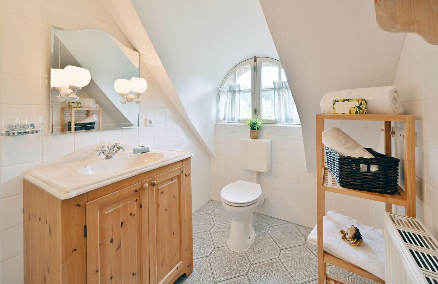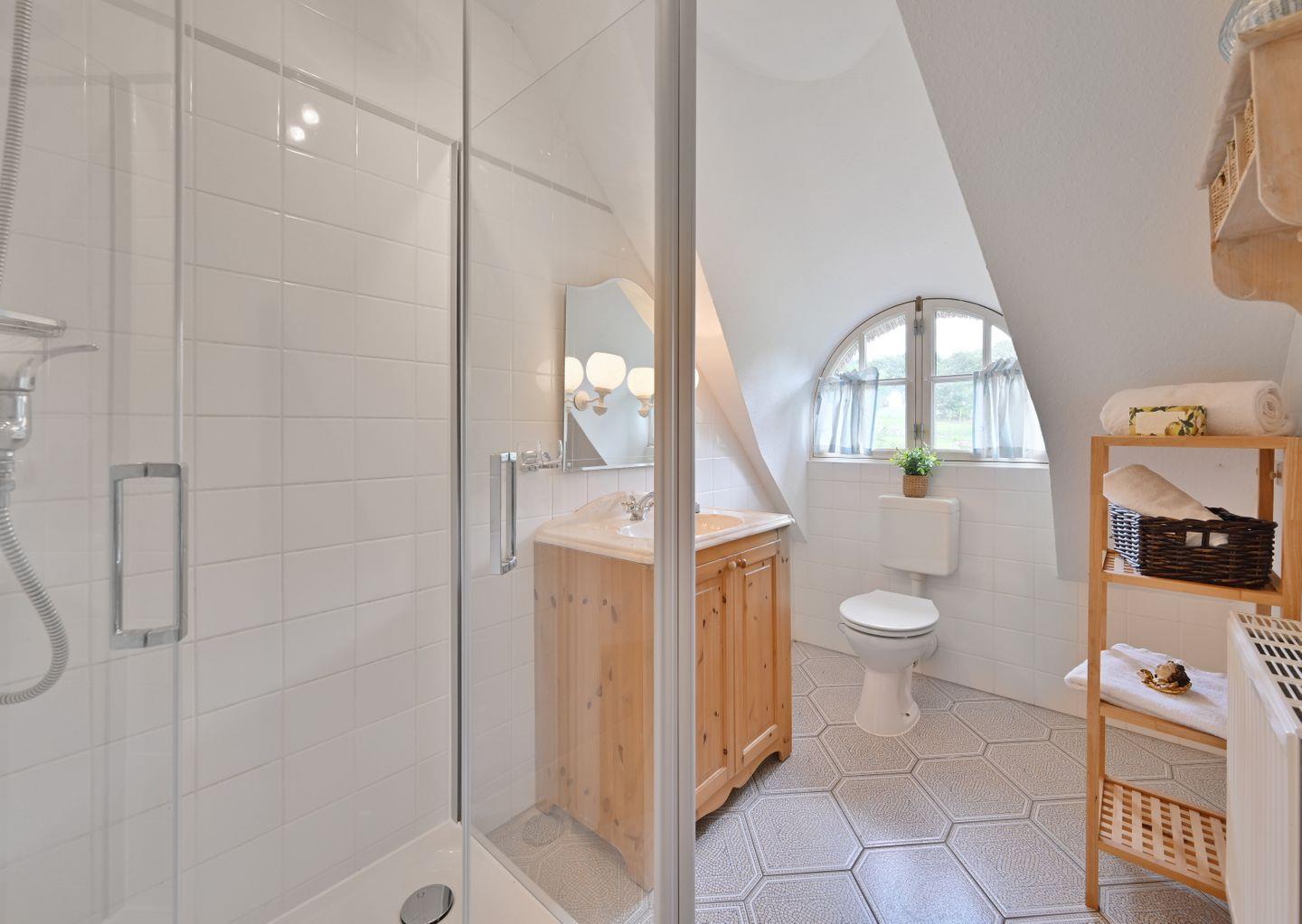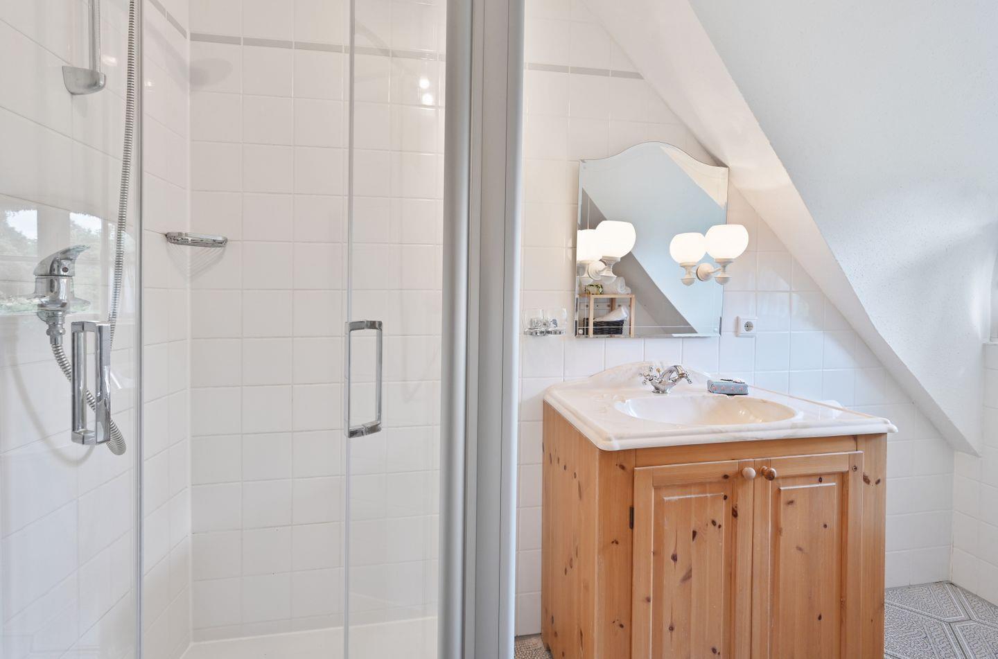 Das Bad im Obergeschoß verfügt über eine Dusche und Haartrockner und hat ein Fenster. Im Schlafzimmer gibt es ein Doppelbett.