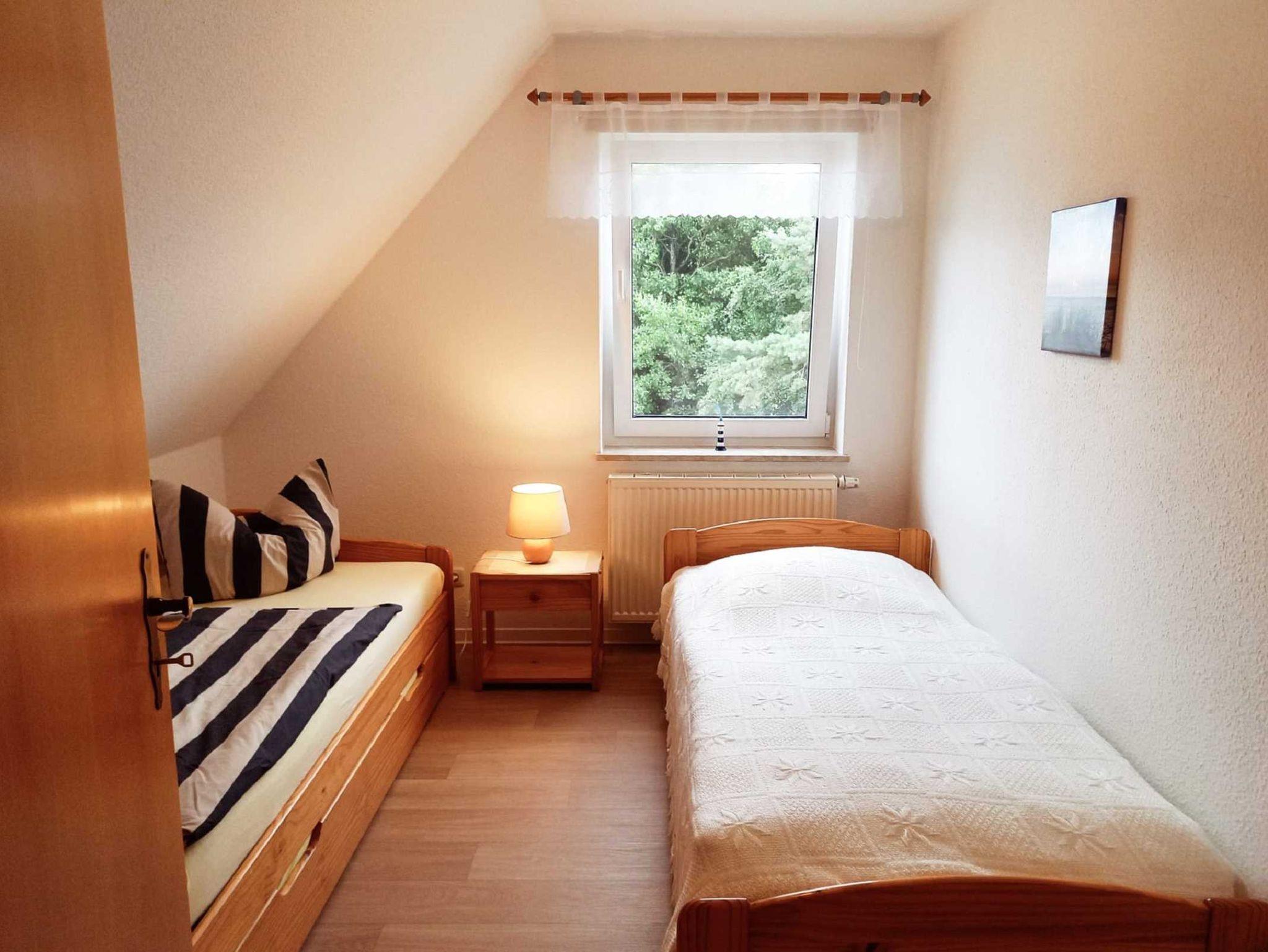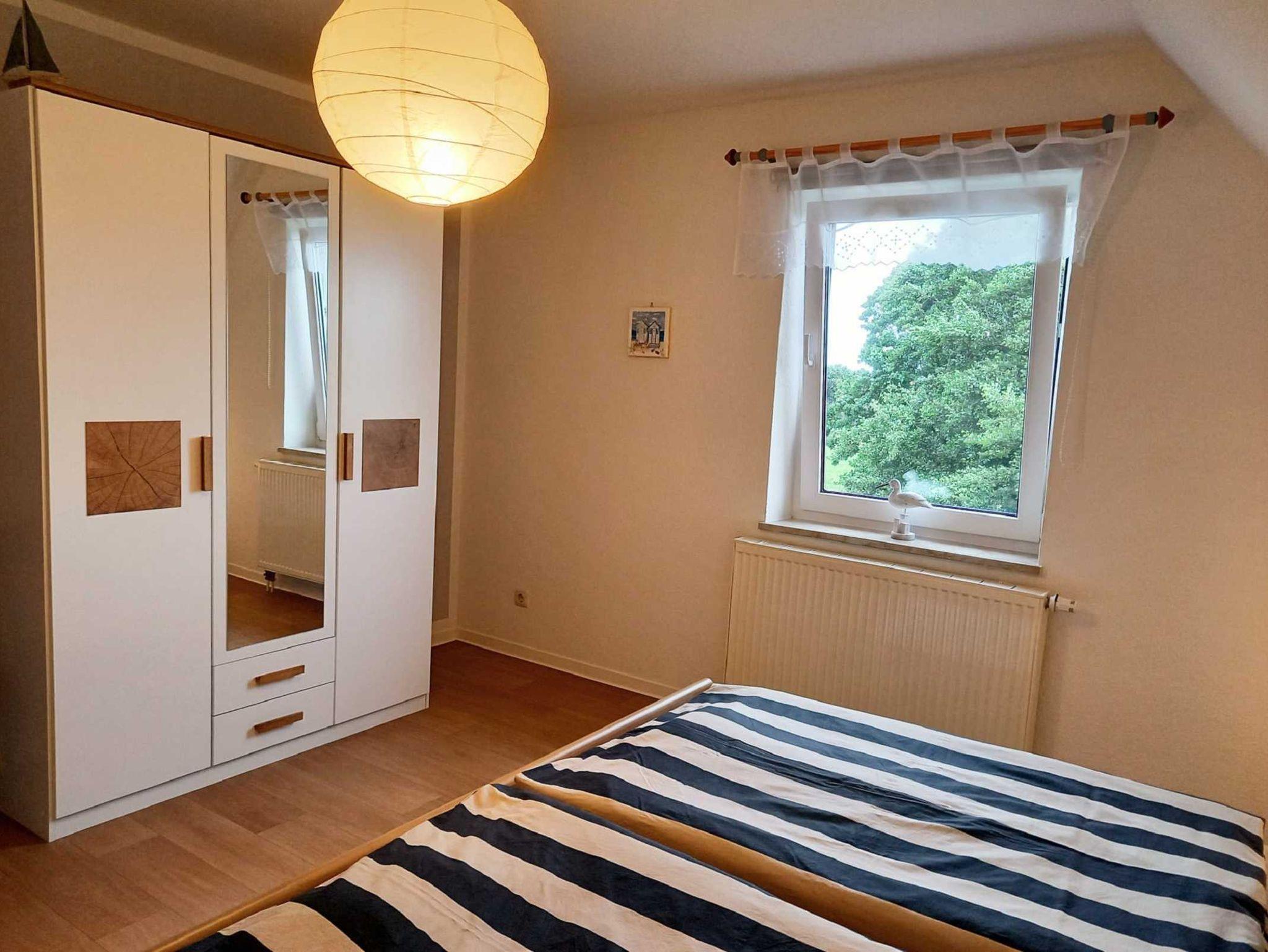Die ca. 50 m² große Ferienwohnung im Obergeschoss verfügt über eine behagliche Ausstattung für Platz bis zu 6 Personen. Zwei Schlafräume mit einem Doppelbett, zwei Einzelbetten und im Wohnzimmer mit Platz für zwei Personen auf dem Schlafsofa. Im Wohnzimmer befindet sich außerdem eine vollausgestattete Küchenzeile mit Backofen, zwei Herdplatten, Kaffeemaschine, Toaster, Wasserkocher und Kühlschrank mit TK-Fach, sowie einem Esstisch mit sechs gemütlichen Stühlen. Im Garten stehen für Sie Gartenmöbel und eine Grillmöglichkeit zur Verfügung.