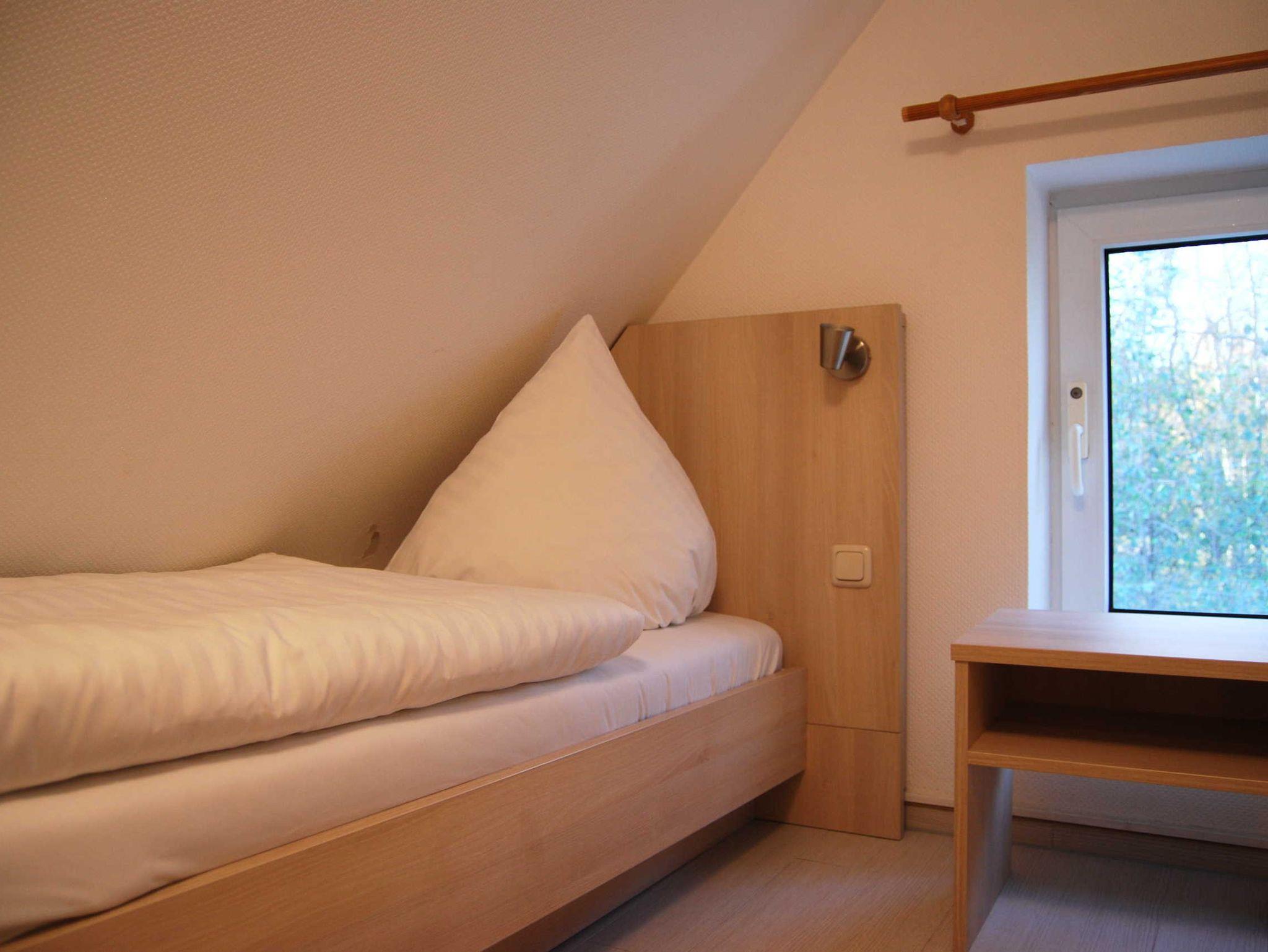 Die Ferienhaushälfte südlich von Vitte ist in Erdgeschoss und Spitzboden aufgeteilt. Der Wohnbereich ist mit einer ausziehbaren Schlafcouch, Sessel, Esstisch, Pantryküche und Farb-TV ausgestattet. Das Bad besitzt Dusche und WC. Eine Raumspartreppe führt zum offenen Schlafraum mit zwei Betten unter dem Spitzdach.