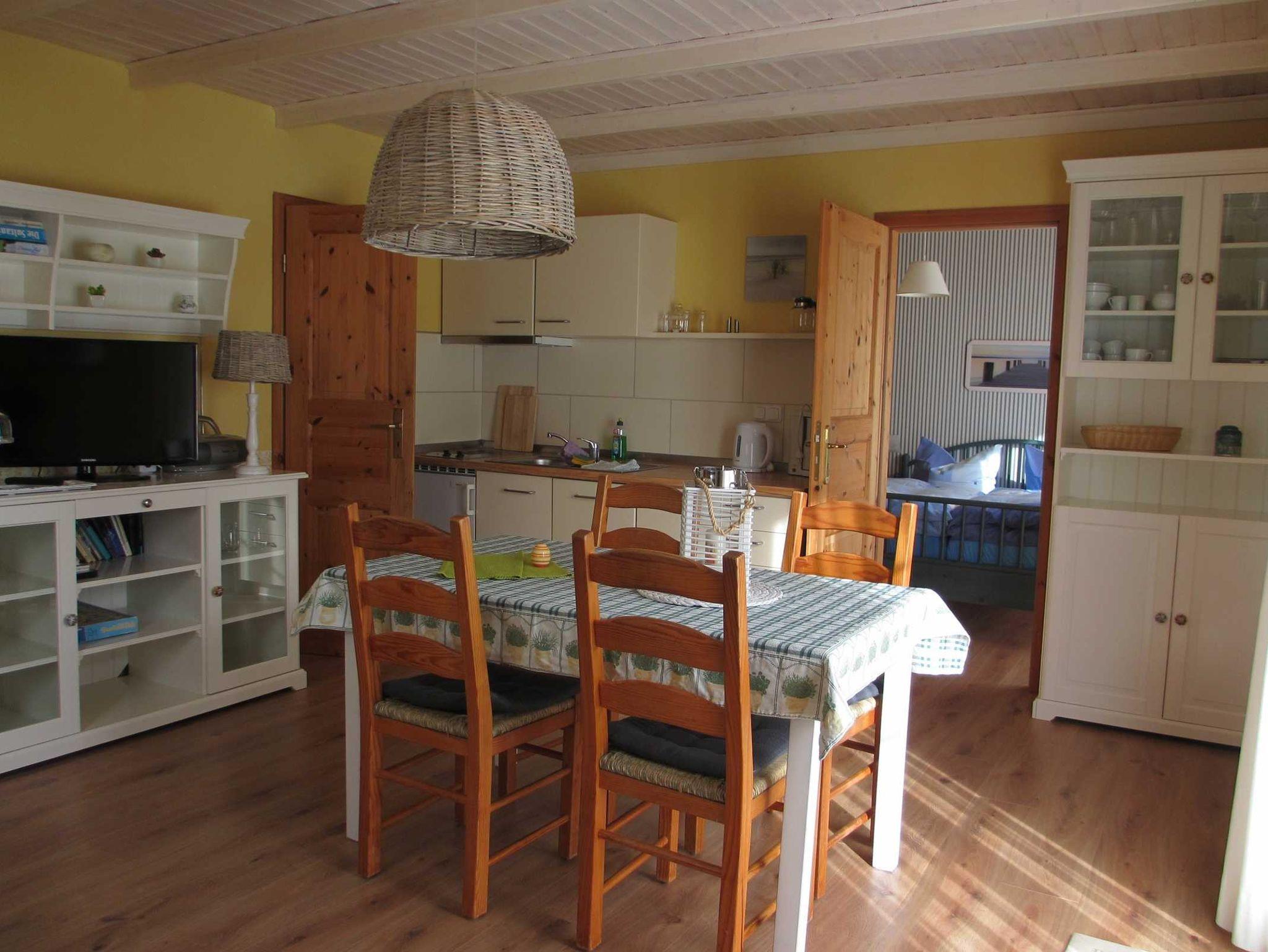 Diese Ferienwohnung befindet sich im Erdgeschoß auf der Südseite des Hauses und ist flächenmäßig mit ca. 40 m² die größte Wohnung. Sie ist aufgeteilt in einen Schlafraum, Wohnraum mit Küchenzeile und Bad mit Dusche und WC. Das Doppelbett im Schlafzimmer hat eine Größe von 1,60m x 2,00m. Im Wohnzimmer steht, falls eine Aufbettung gewünscht wird eine Doppelbettcouch. Zur Wohnzimmerausstattung gehören außerdem W-LAN, ein Fernseher, Radio mit CD-Player. Die Küche hat folgende Ausstattung, Cerankochfeld, Kühlschrank mit kleinem Gefrierfach, Geschirrspüler, Kaffeeautomat, Wasserkocher, Toaster sowie div. Geschirr und Küchenutensilien.