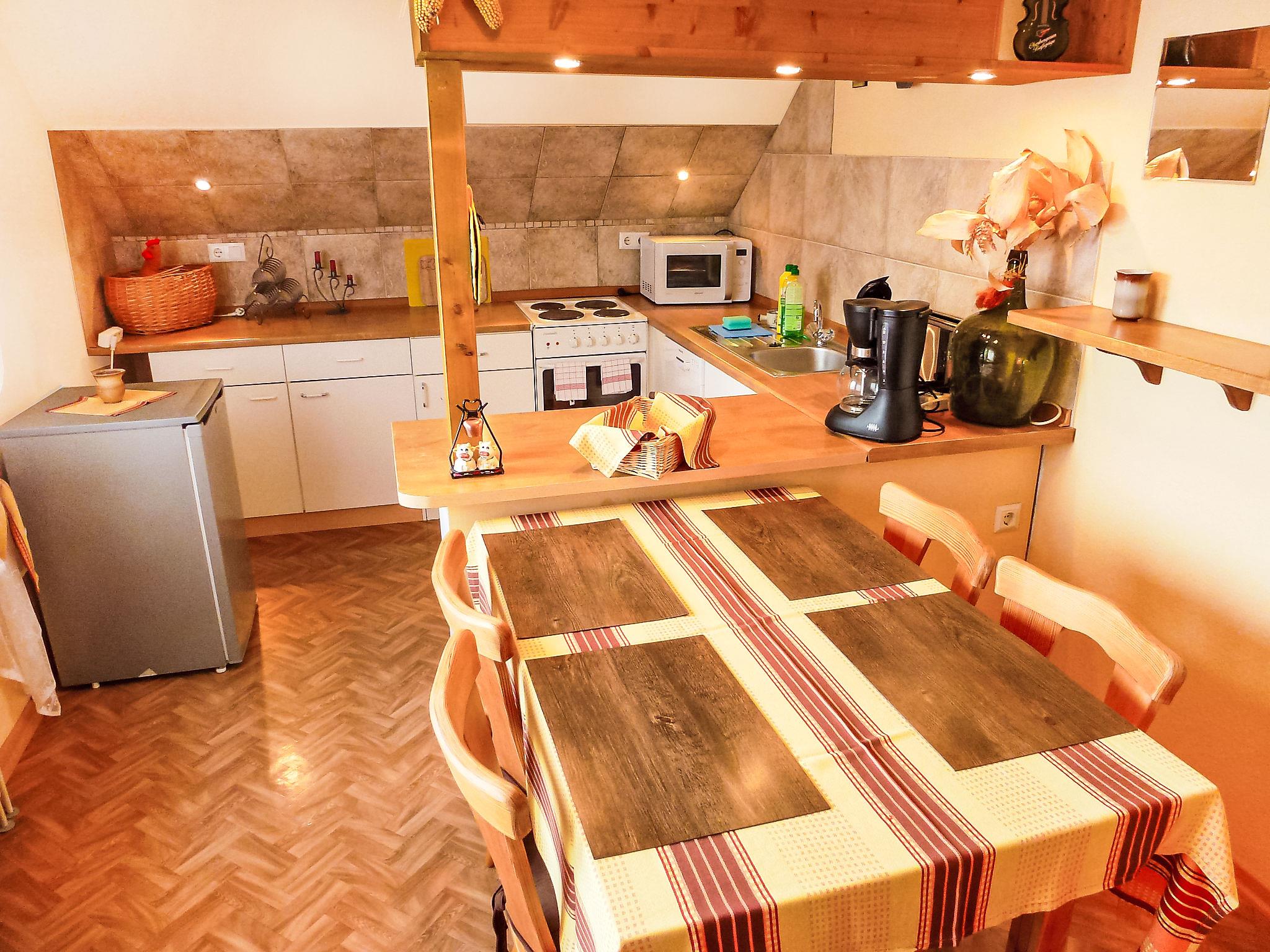 2-Zimmer-Wohnung 50 m2, im Dachgeschoss. Teilweise abgeschrägt: Wohn-/Esszimmer mit 1 Doppeldiwanbett. Wohn-/Schlafzimmer mit 1 Doppelbett und Sat-TV. Offene Küche (4 Kochplatten, Backofen, Geschirrspüler, Mikrowelle, elektrische Kaffeemaschine). Bad/WC. Zur Verfügung: Internet (Wireless LAN, gratis). Bitte beachten: Nichtraucher-Unterkunft. Maximal 2 Haustiere/Hunde erlaubt.