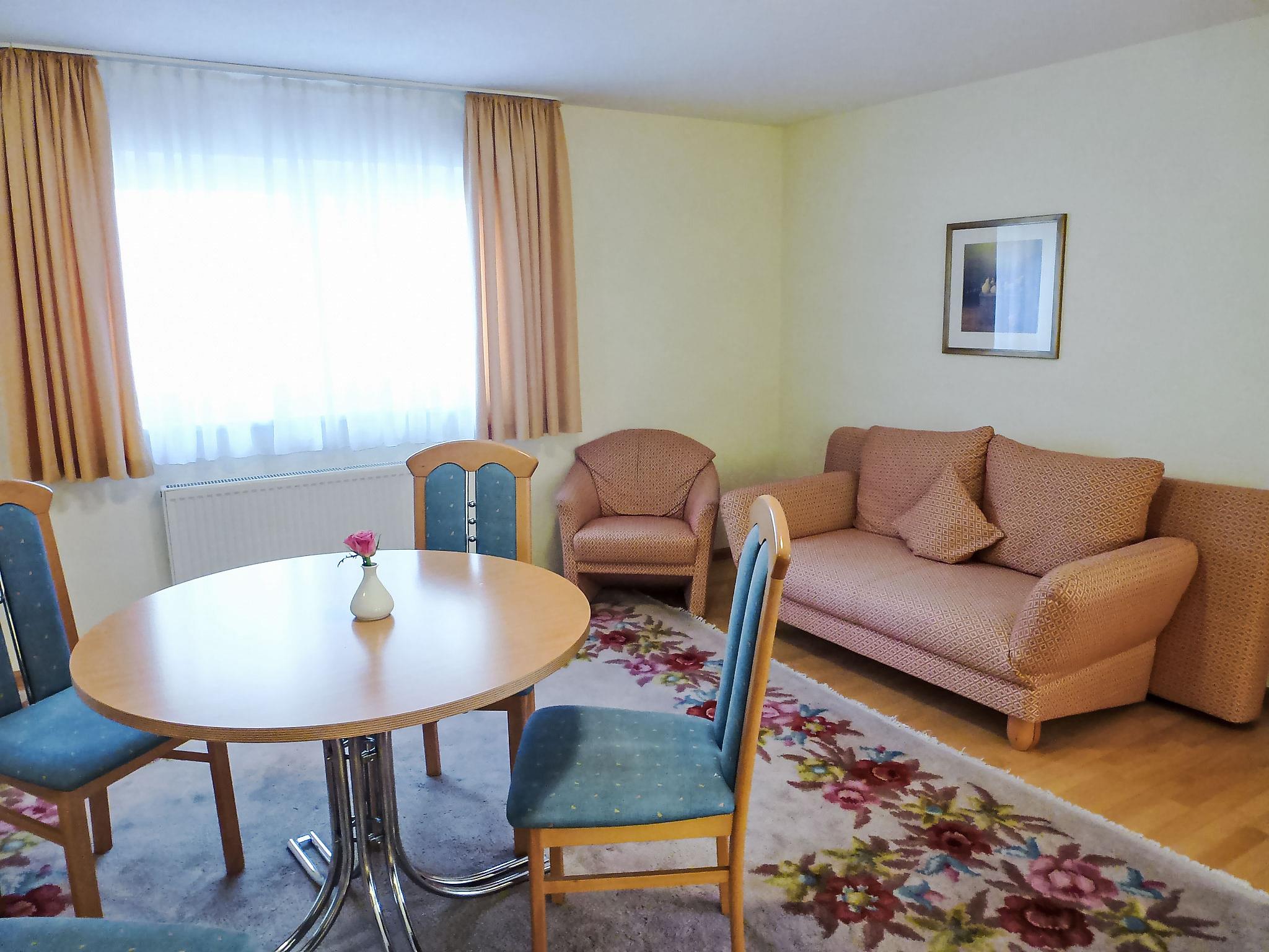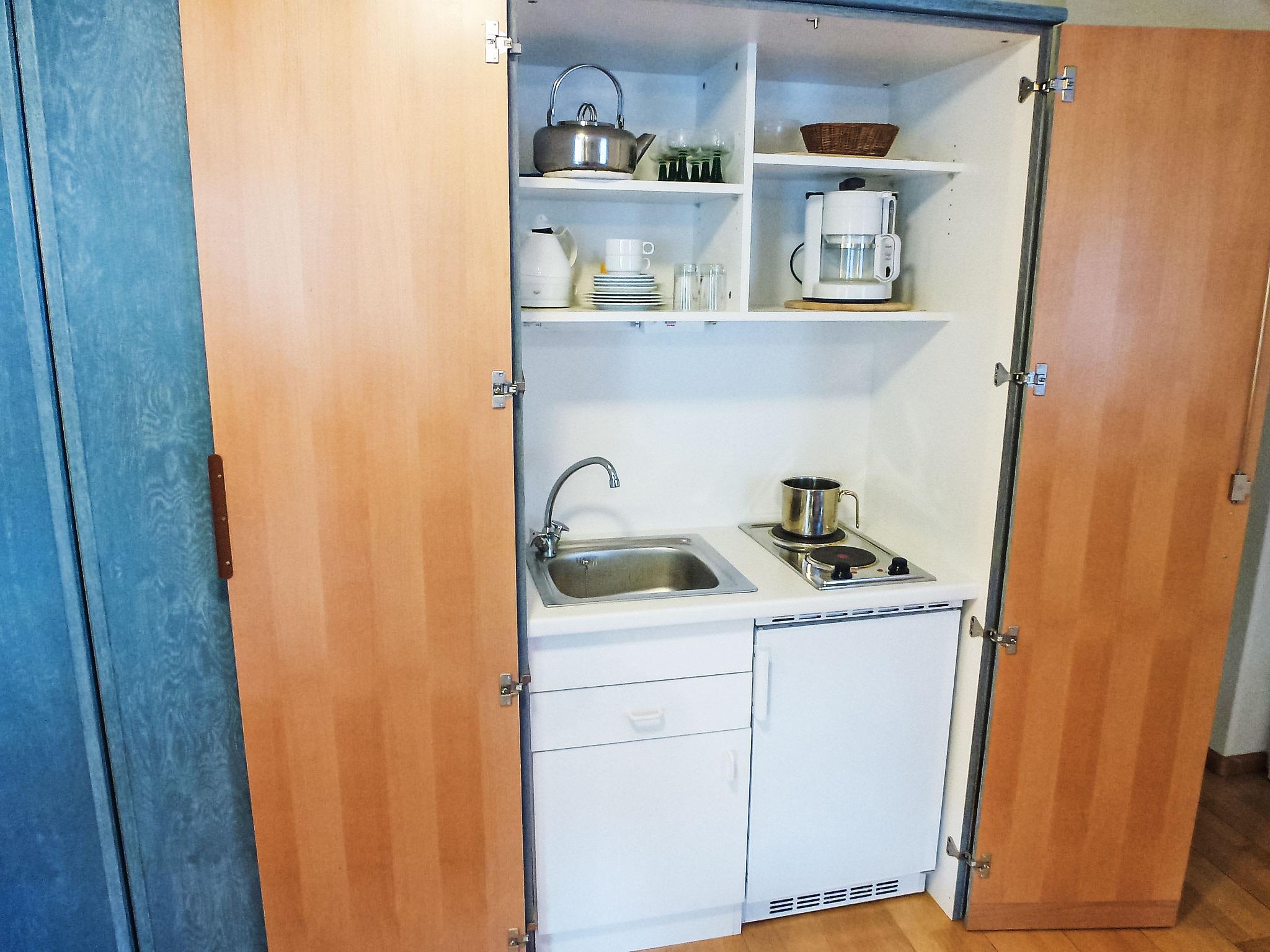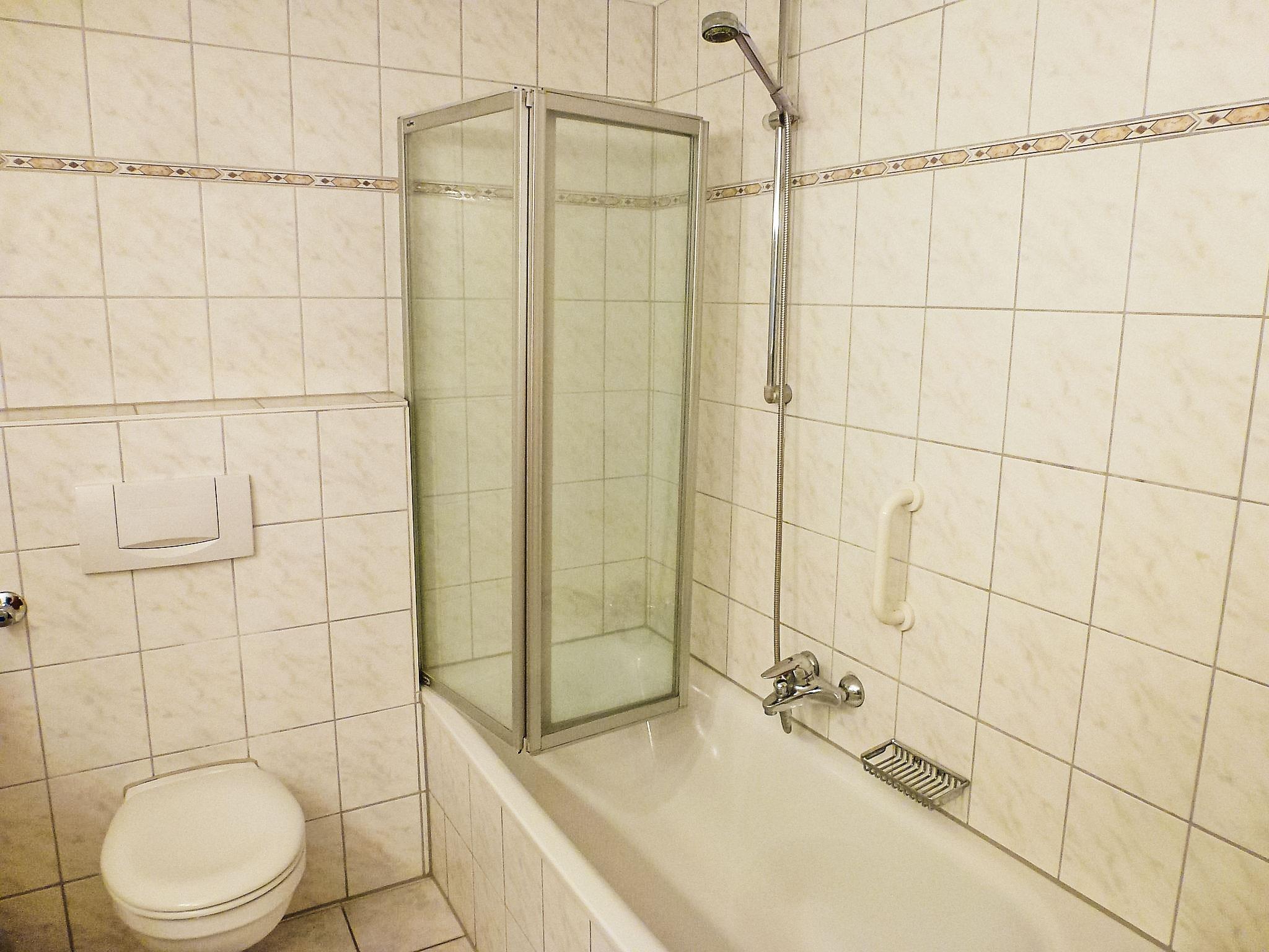1-Zimmer-Wohnung 50 m2 im 1. Stock. Objekt geeignet für 2 Erwachsene + 1 Kind. Wohn-/Schlafzimmer mit 1 Diwanbett, 1 Doppelbett und Sat-TV. Ausgang zum Balkon. Kleine Kochnische (2 Kochplatten, elektrische Kaffeemaschine). Bad/WC. Balkonmöbel. Zur Verfügung: Internet (Wireless LAN, gratis). Bitte beachten: Nichtraucher-Unterkunft.