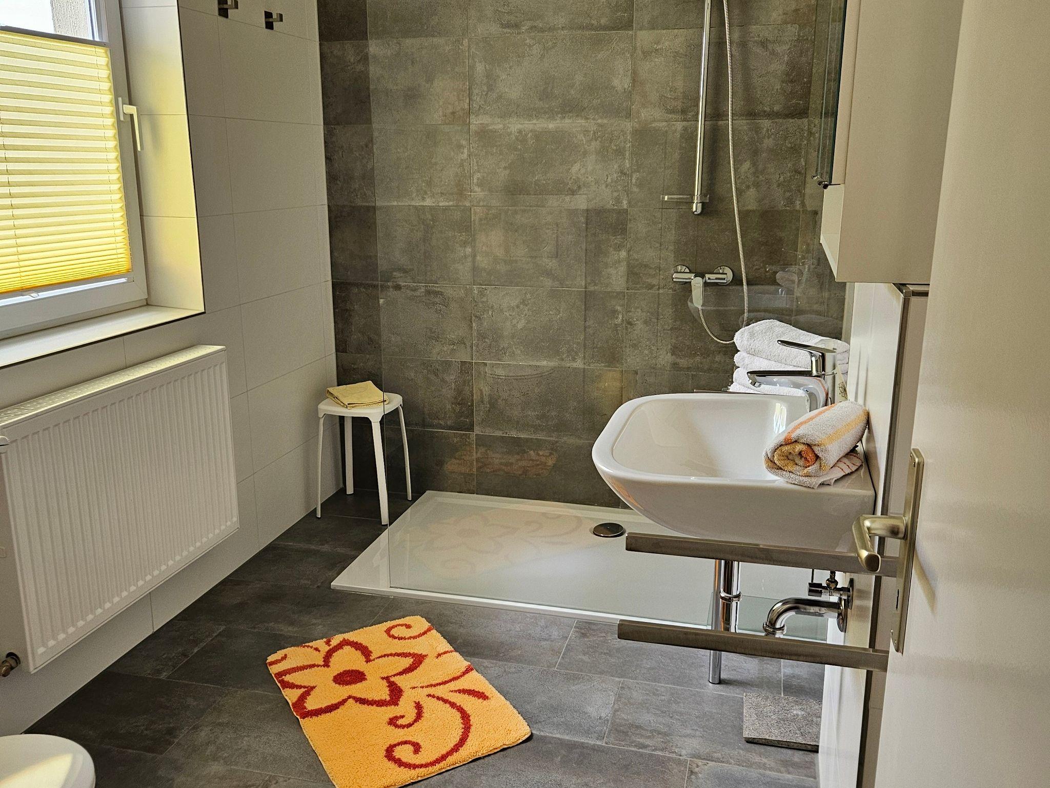 Das helle Badezimmer mit Dusche, Waschbecken und WC hat ein großes Fenster.