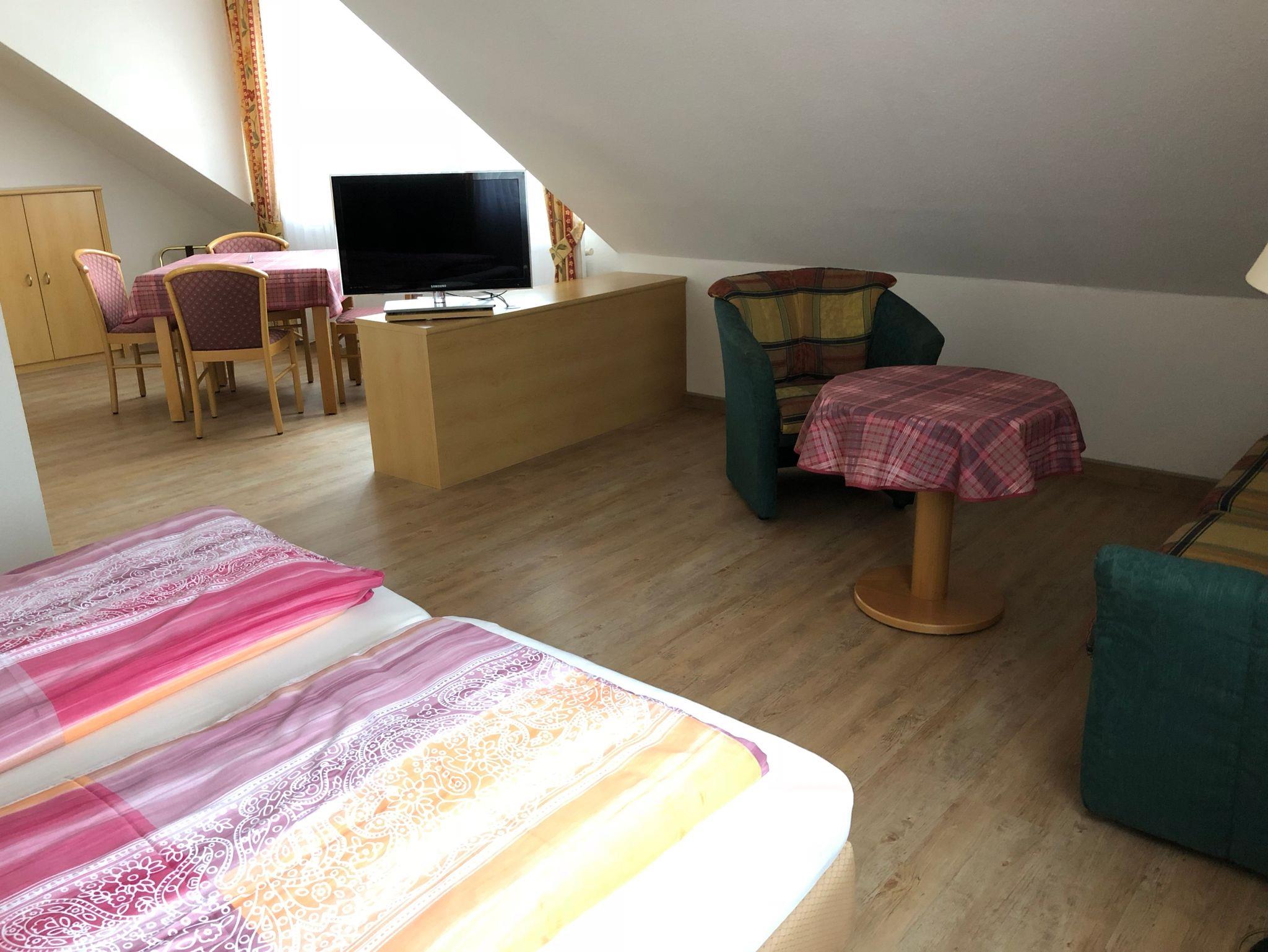 Einraumappartement Nr.5 mit ca 40 qm besitzt zwei Boxspringbetten (trennbar) und zwei Schlafcouchen, Küchenzeile und neue barierefreie Dusche mit WC.