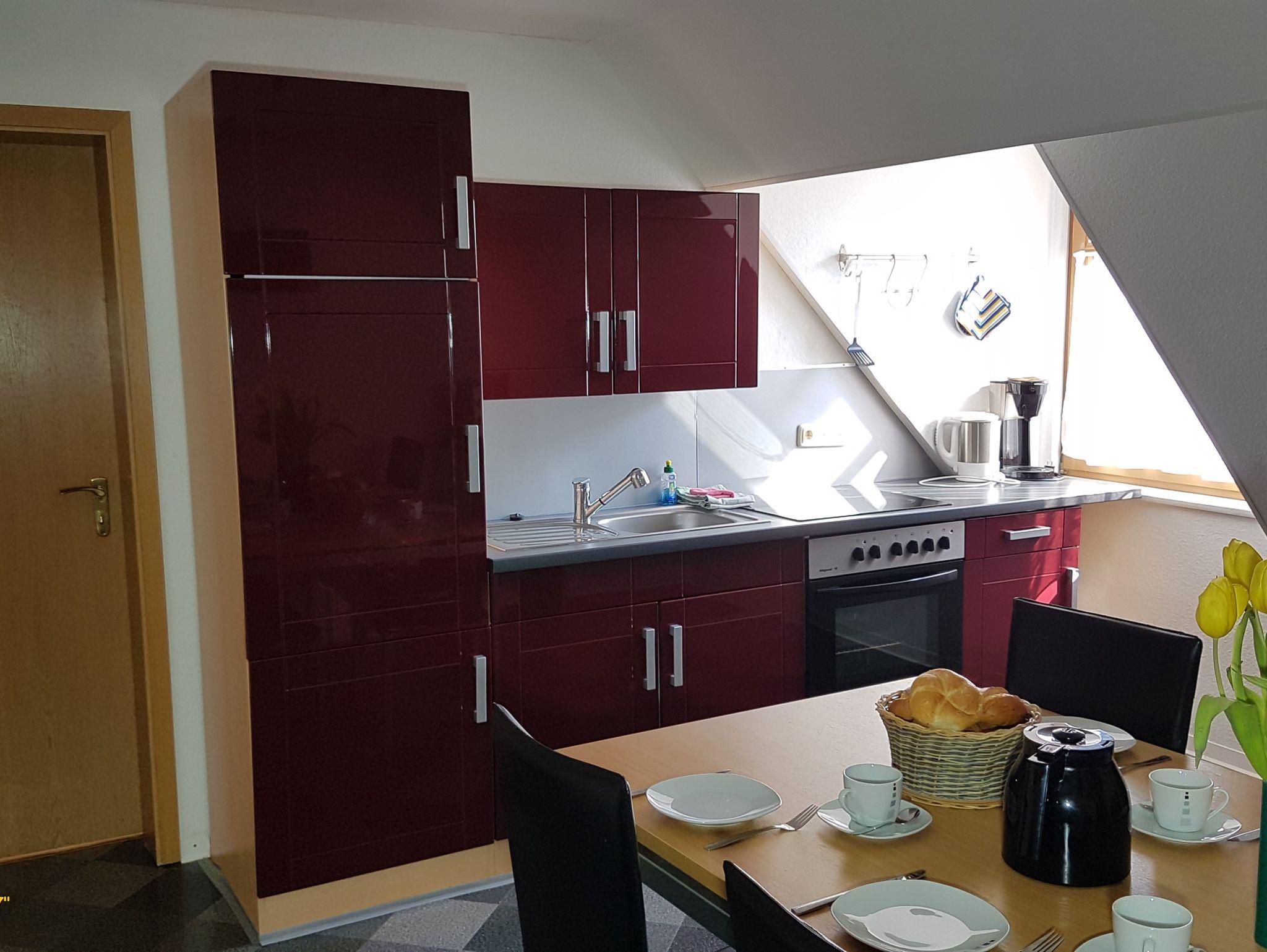 Die Küche ist ausgestattet mit E-Herd, Kühlschrank mit Gefrierfach, Mikrowelle, Kaffeemaschine und Wasserkocher
