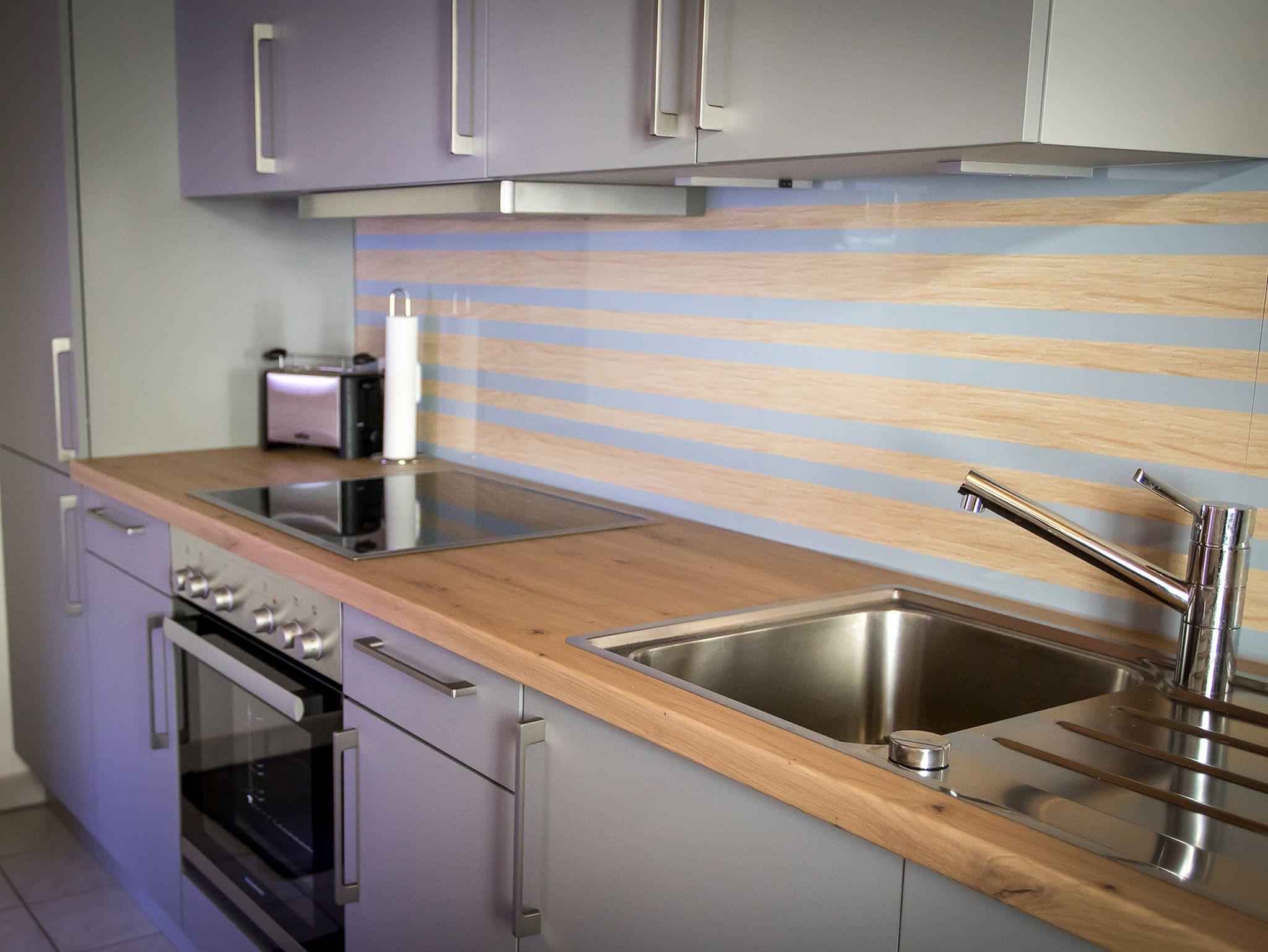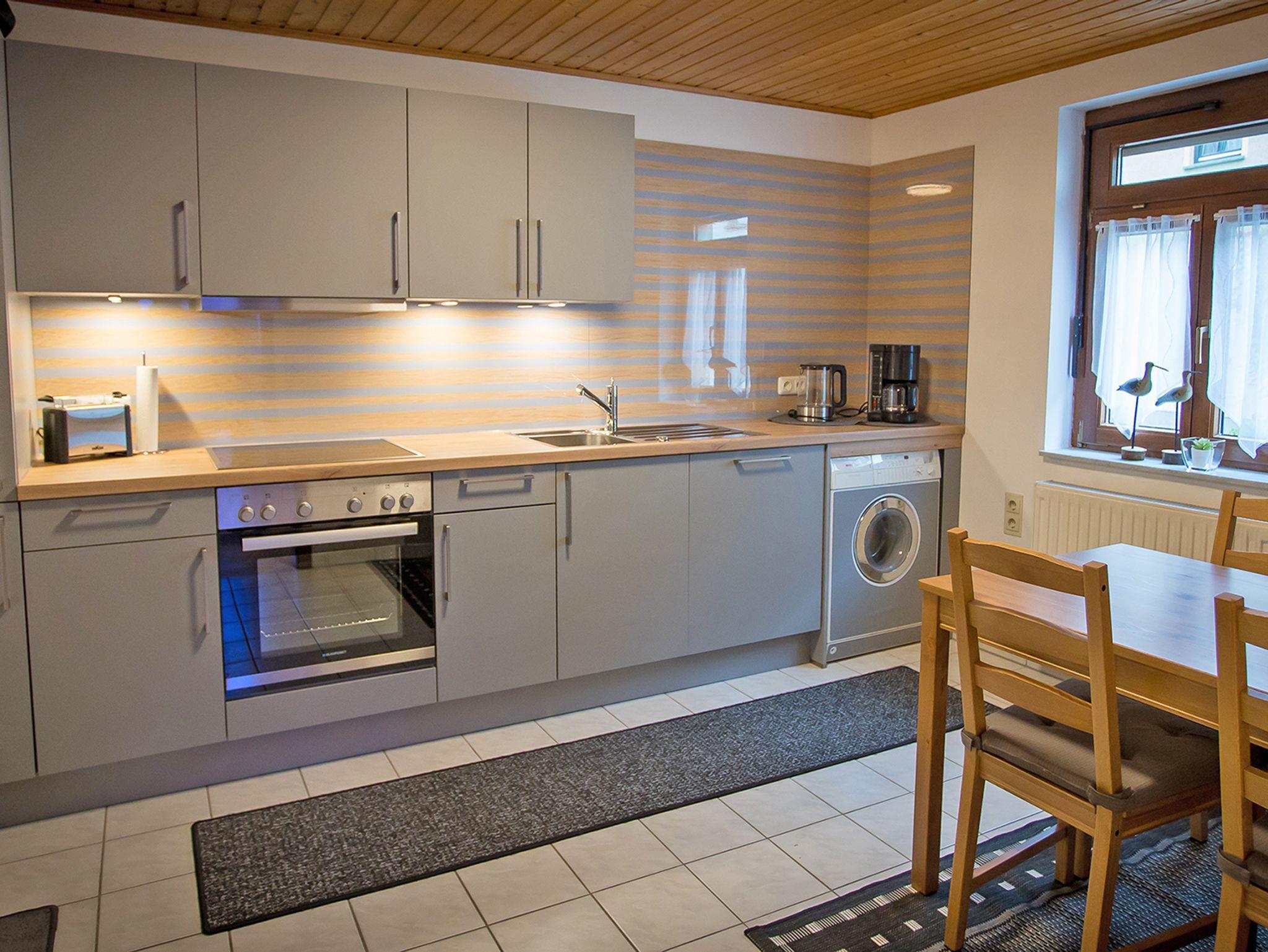 Die Einbauküche ist ausgestattet mit Cerankochfeld, Backofen, Spülmaschine, Kühlschrank (mit Gefrierfach), Kaffeemaschine, Wasserkocher und Toaster.