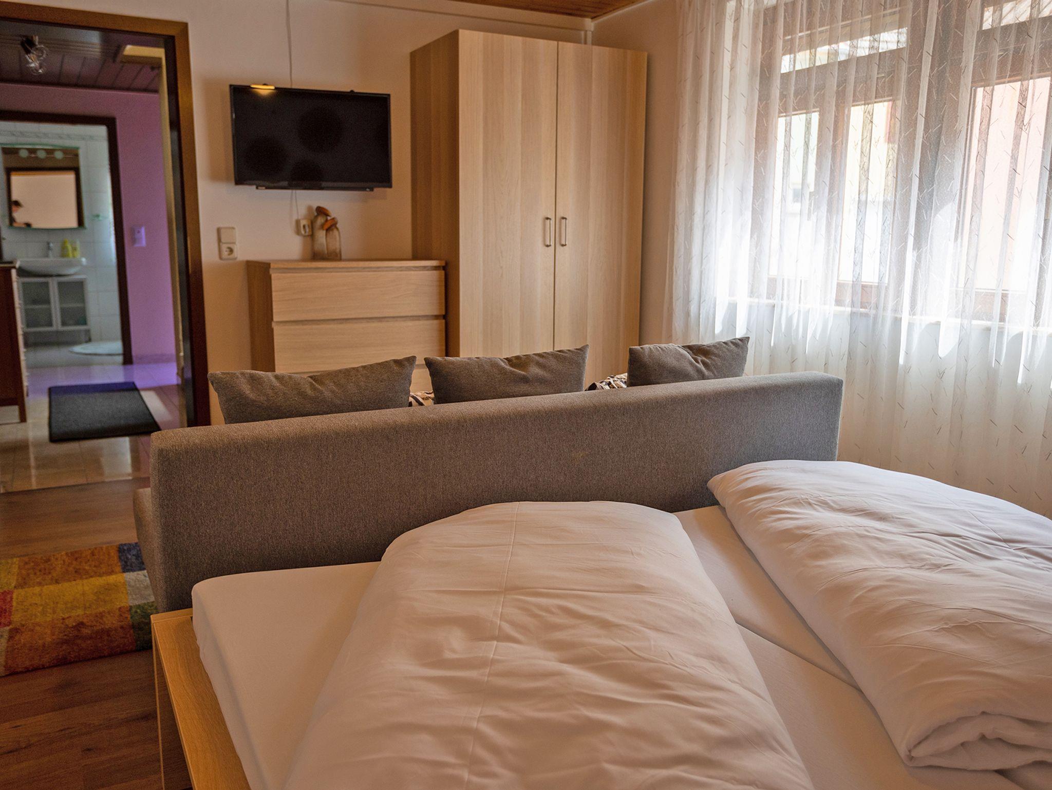 Im Schlafzimmer befindet sich ein Doppelbett (1,8 x 2m) mit getrennten Matratzen und eine Schlafcouch (aufklappbar), die Bettwäsche ist vorhanden.