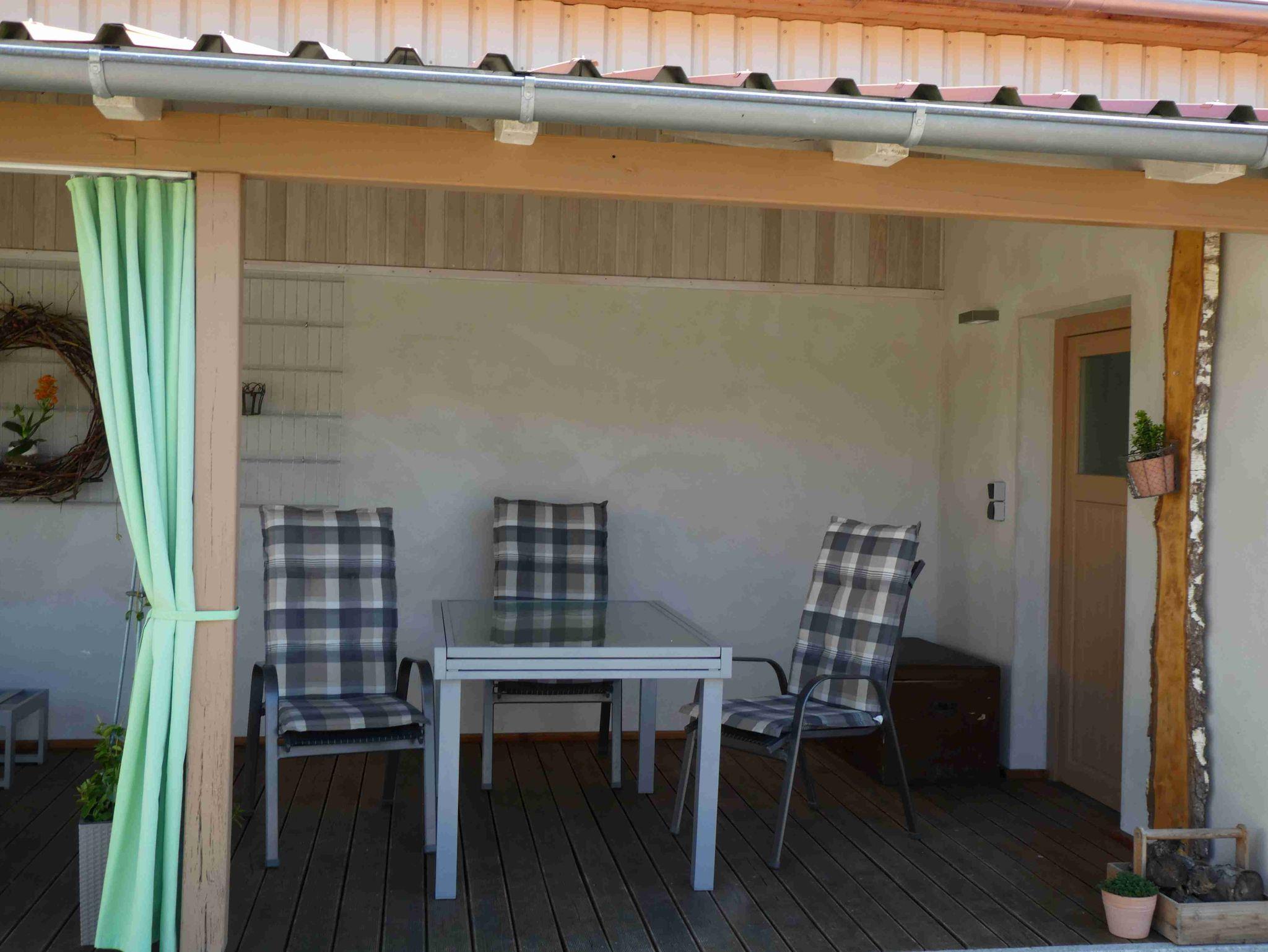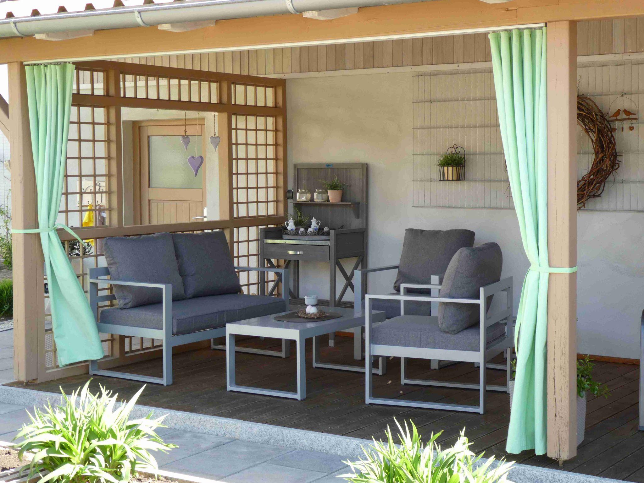 Überdachte Terrasse im Innenhof mit Blick in den Blumengarten.