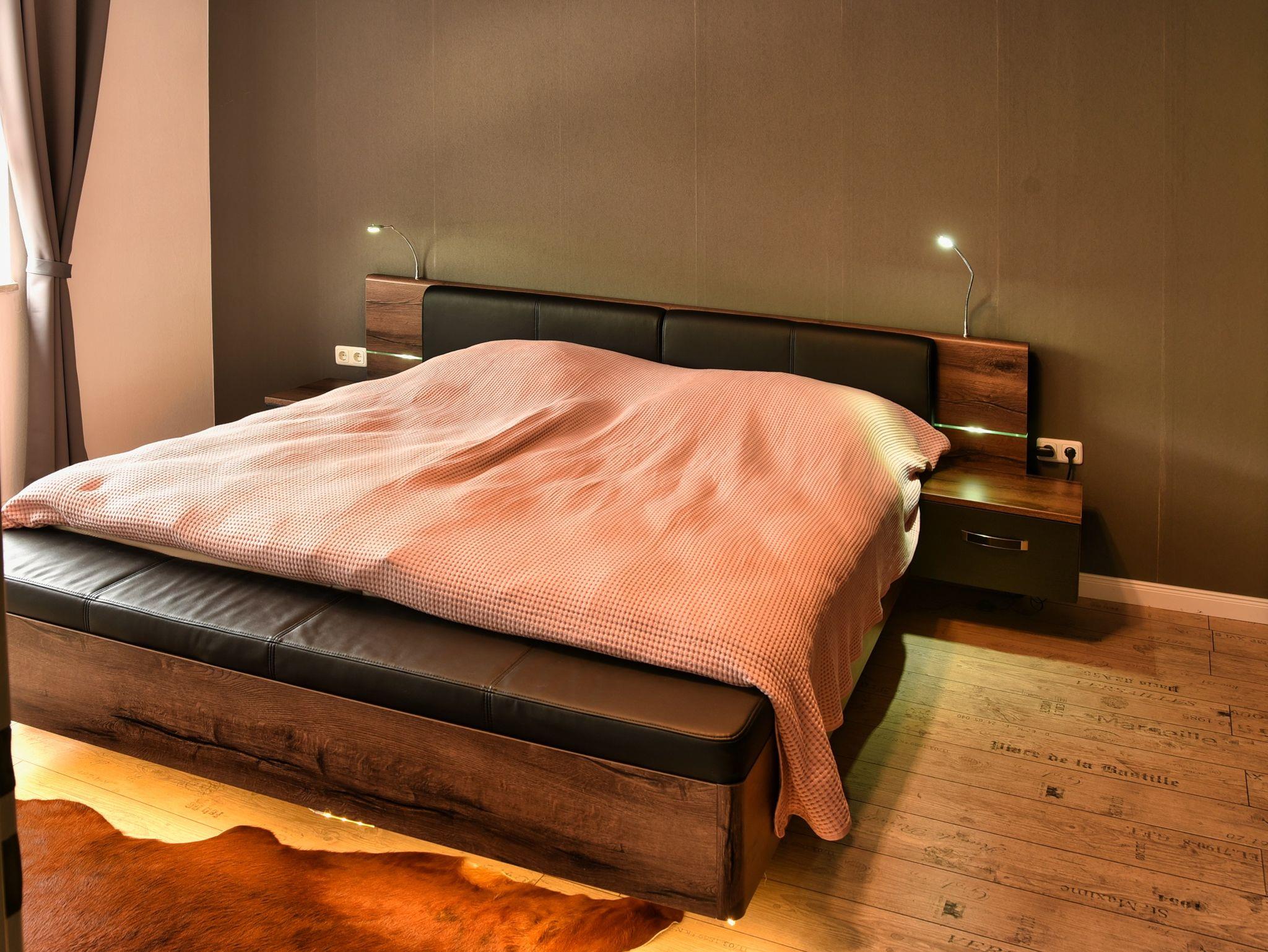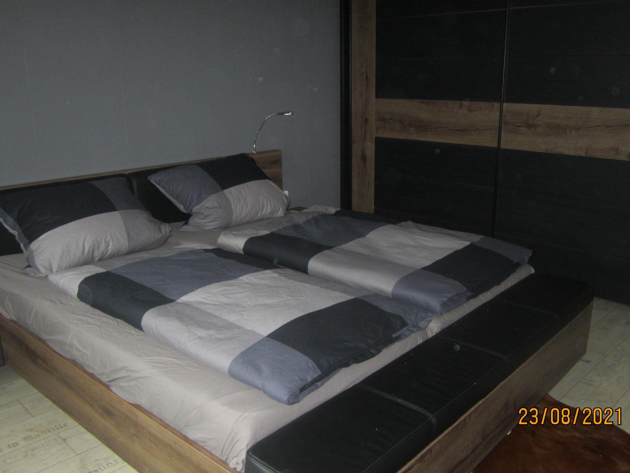 Schlafzimmer mit großem Kleiderschrank, Doppelbett 180 x 200cm, Sitzbank am Bettende mit Staufach.