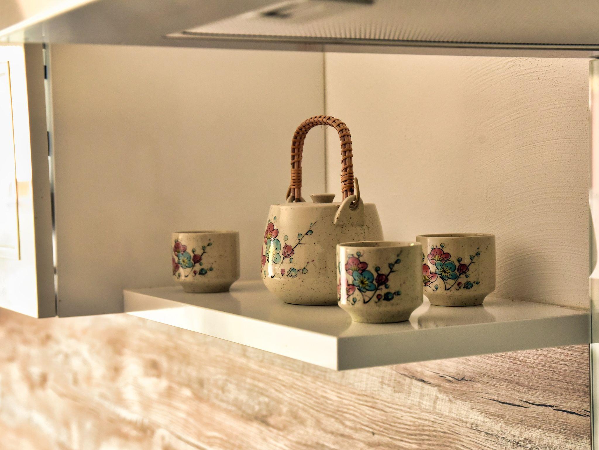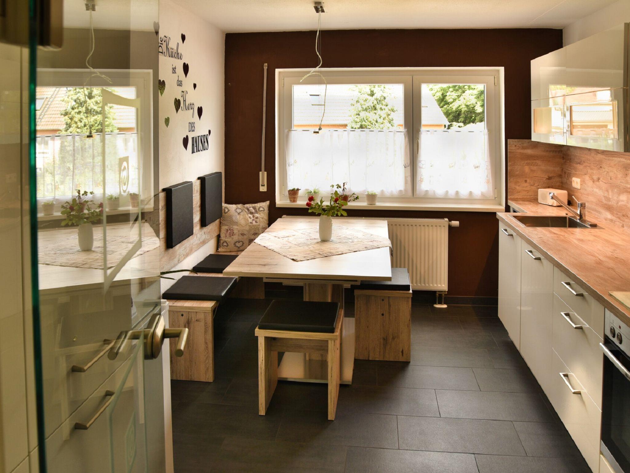 Die Küche ist voll ausgestattet: gemütliche Sitzecke, Herd mit Ceranfeld und Backofen, hygienische Edelstahlspüle, Spülmaschine, Wasserkocher, Radio, Toaster usw. Gläser, Geschirr, Besteck, Töpfe usw.
