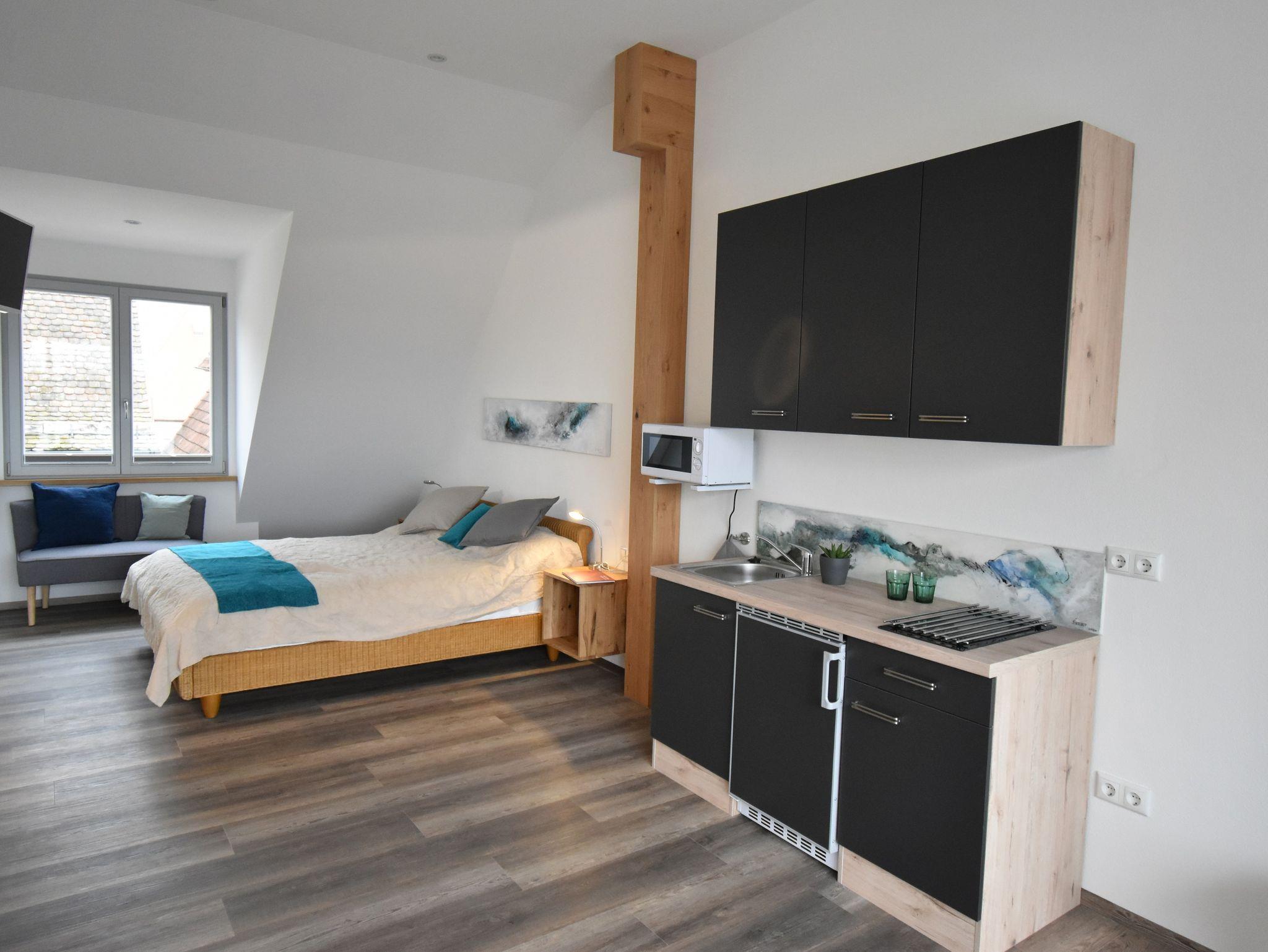 Das Appartment mit einer Größe von 50 qm verfügt über ein Wohn-/Schlafzimmer mit Küchenzeile sowie einer separaten Sitzgelegenheit und SAT-TV. Im gemütlichen Doppelbett können Sie sich von Ausflügen in die Altstadt und Umgebung erholen.