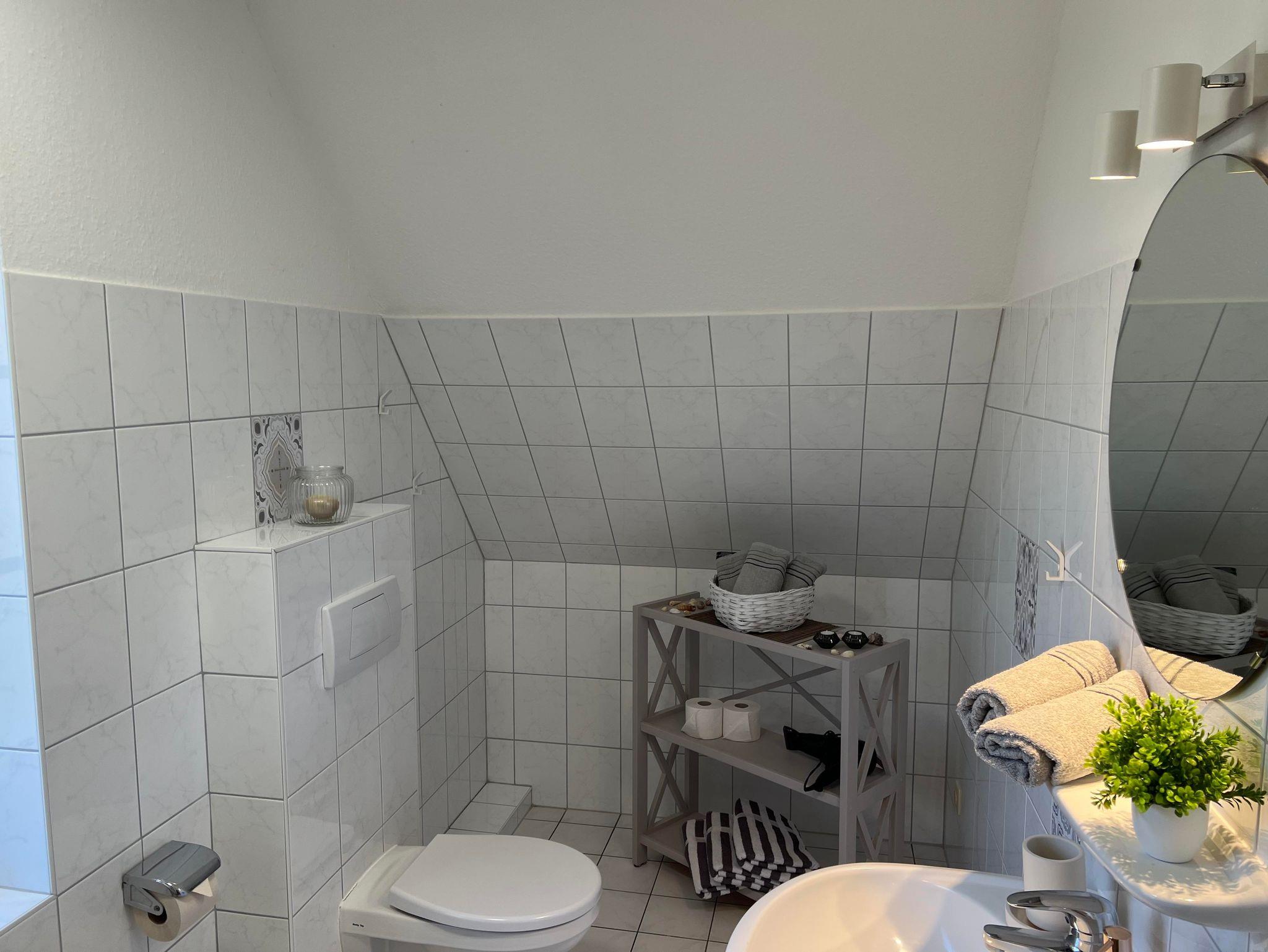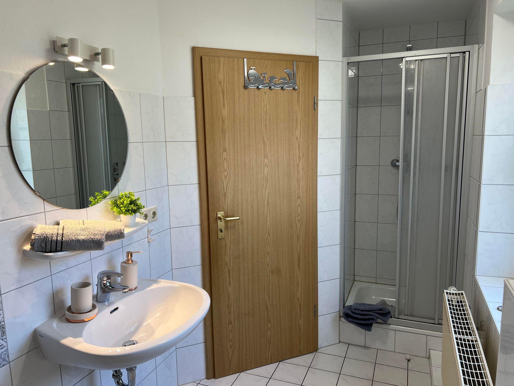 Das Duschbad ist mit einer Fußbodenheizung und ebenso mit einem Fön ausgestattet.