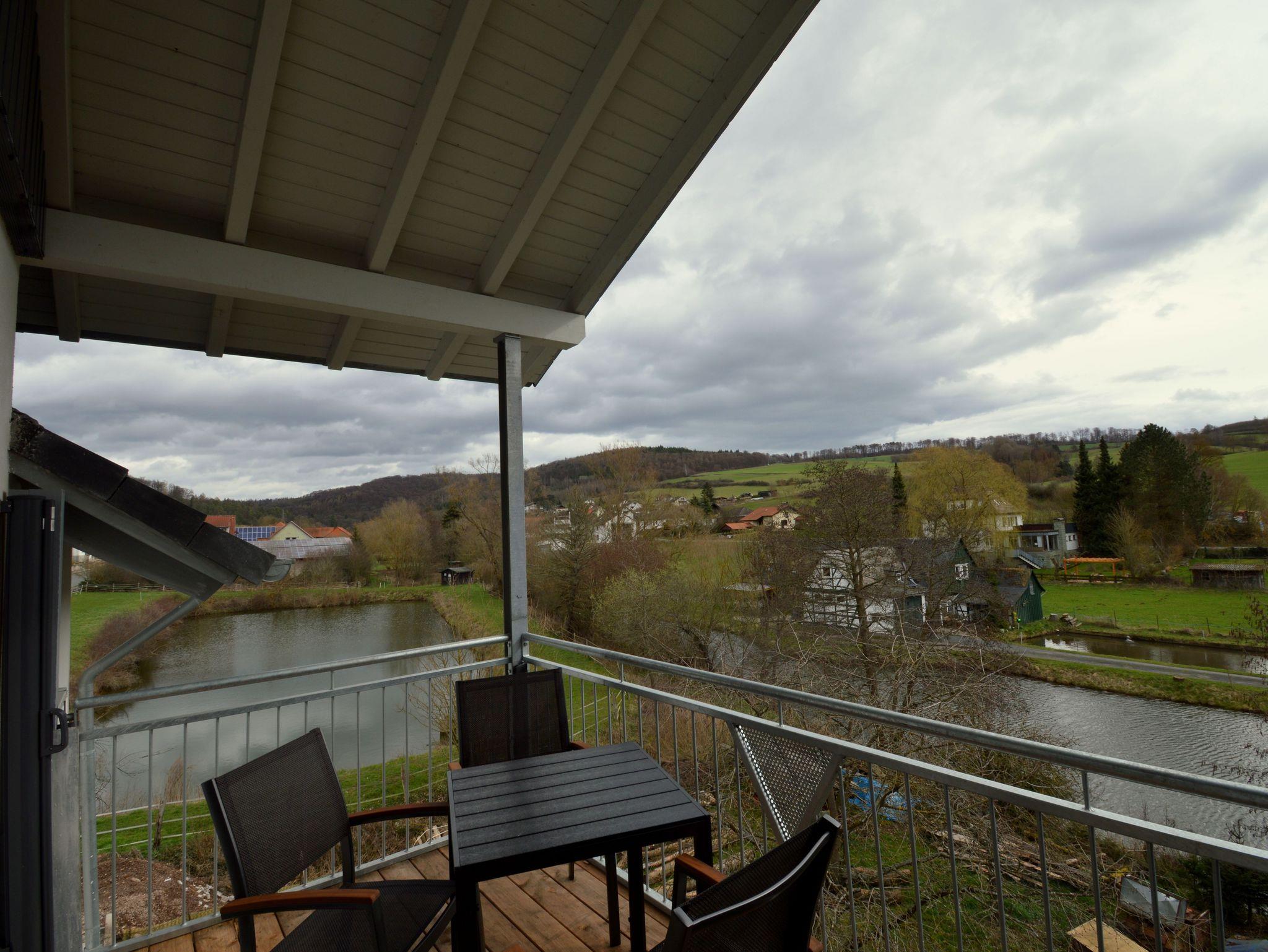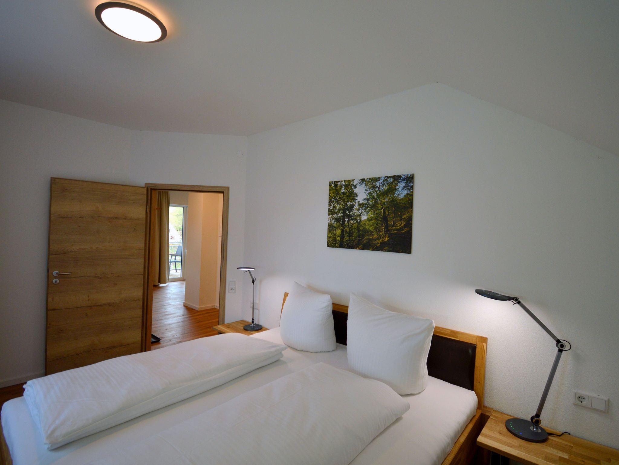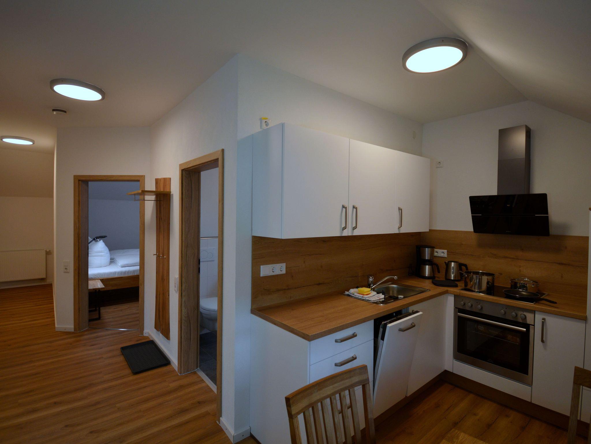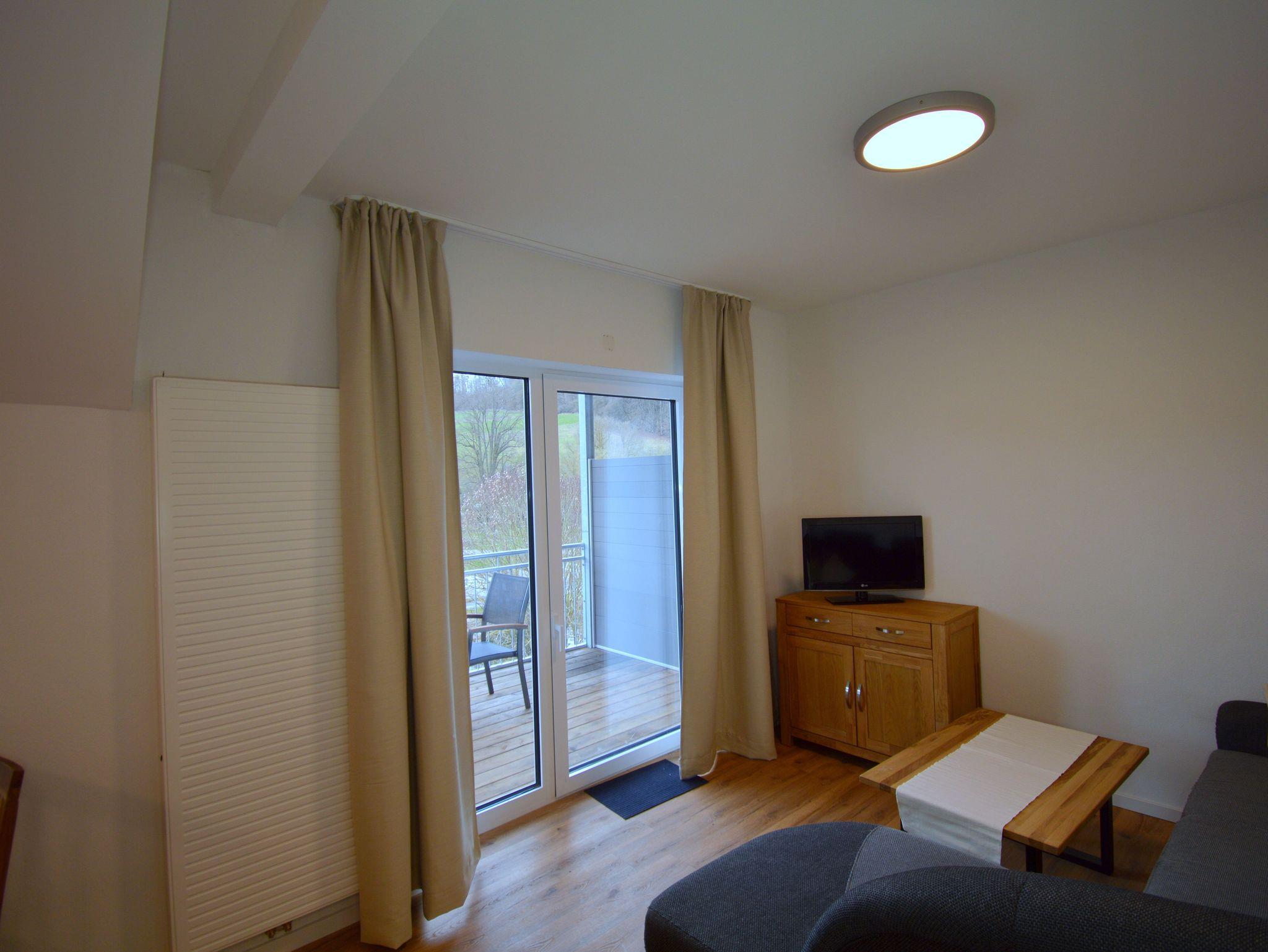 Die moderne Zwei Zimmer Wohnung liegt im zweiten Stock unseres Hauses. Die Wohnung ist mit 47 qm perfekt für einen Urlaub zu zweit. Das Schlafzimmer ist mit einen großen Doppelbett (180 cm x 200 cm) ausgestattet. Besonderes Highlight im Schlafzimmer sind die Nachttischlampen mit verschiedenen Lichtstimmungen, je nachdem, ob Sie helles Licht zum Lesen benötigen oder ein warmes Licht zum Relaxen. Die Schlafzimmer lassen sich für besonders erholsame Nächte komplett verdunkeln. Auf der bequemen Couch haben Sie nach einem erlebnisreichen Tag einen herrlichen Ausblick auf die Natur. Die große Küche ist ausgestattet mit Kühl- und Gefrierschrank, Spülmaschine, Kaffeefiltermaschine, Wasserkocher, Toaster und Eierkocher und vieles andere, was Sie zum Kochen brauchen. Das Badezimmer verfügt neben dem WC über ein Urinal und eine ebenerdige Dusche mit mobilen Duschsitz. Auf dem Balkon lässt es sich in der Morgensonne mit einem Blick auf den Nationalpark und das Vorstaubecken des Edersees gut frühstücken.
