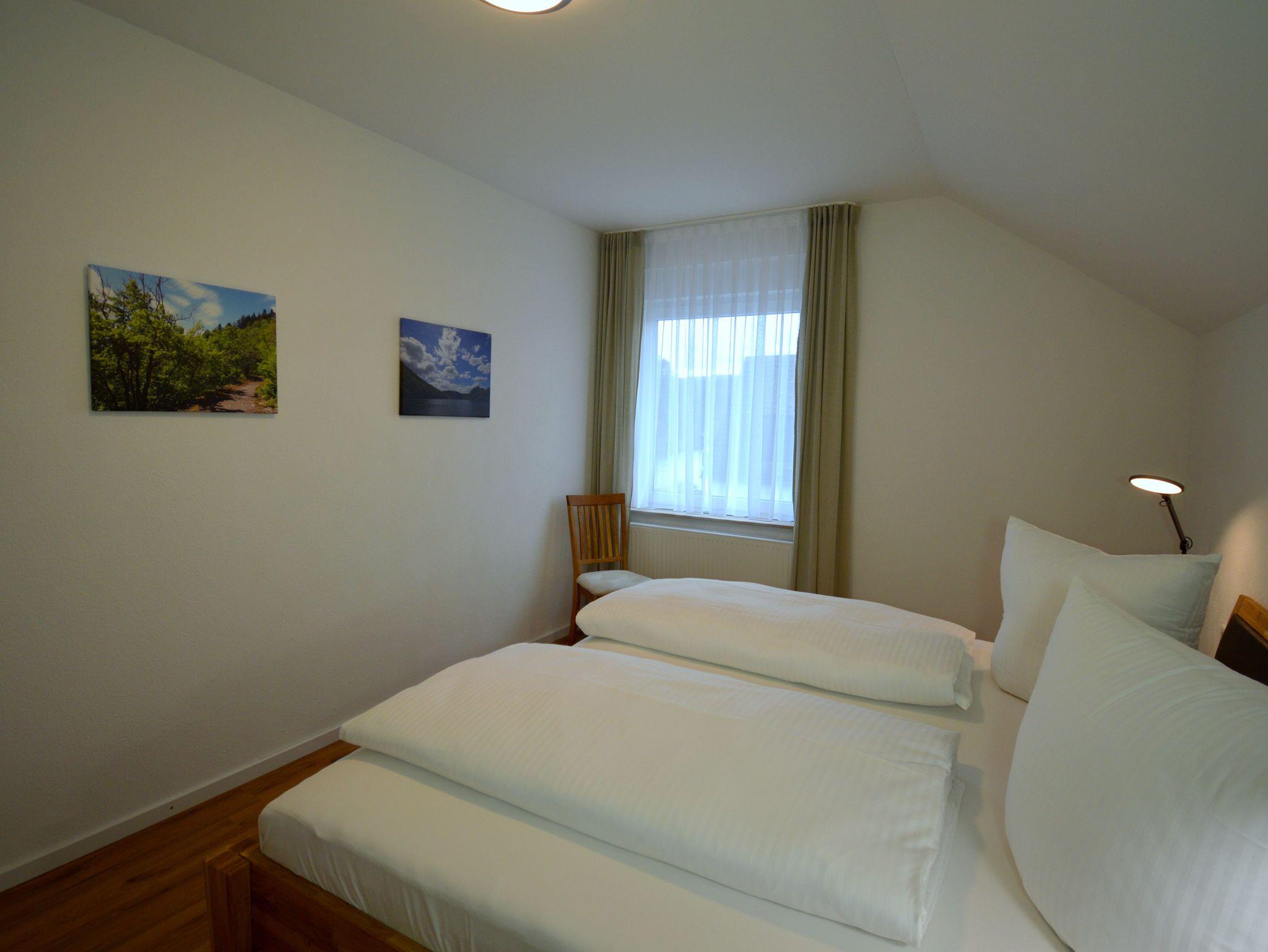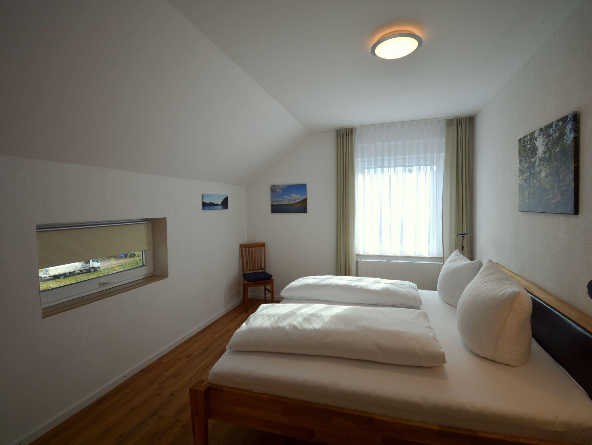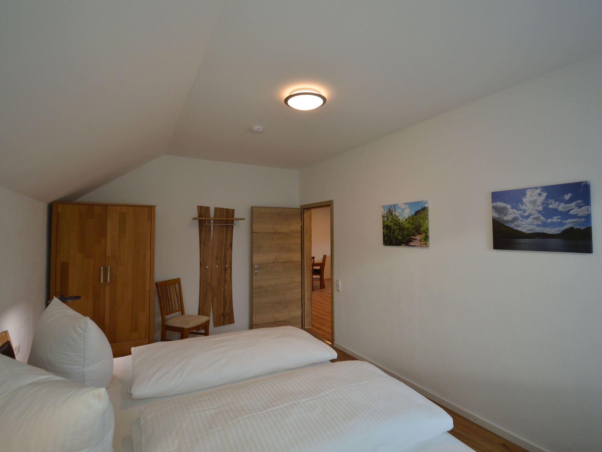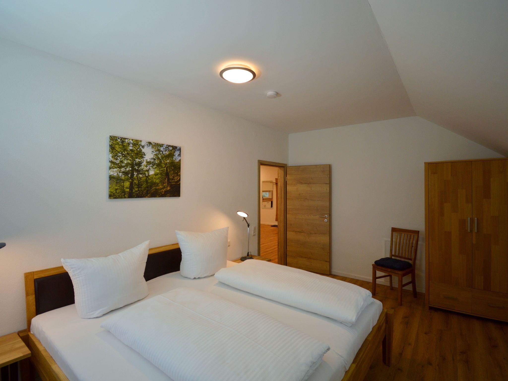 Die moderne Drei-Zimmer Wohnung liegt im zweiten Stock unseres Hauses. Die Wohnung ist mit 82 qm perfekt für einen Urlaub zu viert. Es sind zwei Schlafzimmer mit jeweils einen großen Doppelbett (200 cmx 200 cm) vorhanden. Besonderes Highlight im Schlafzimmer sind die Nachttischlampen mit verschiedenen Lichtstimmungen, je nachdem, ob Sie helles Licht zum Lesen benötigen oder ein warmes Licht zum Relaxen. Die Schlafzimmer lassen sich für besonders erholsame Nächte komplett verdunkeln. Die große Küche ist ausgestattet mit Kühl- und Gefrierschrank, Spülmaschine, Kaffeefiltermaschine, Wasserkocher, Toaster und Eierkocher und vieles andere, was Sie zum Kochen brauchen. Der Wohnbereich bietet sehr viel Platz um sich in Ruhe gemütlich zu entspannen. Das Badezimmer verfügt neben dem WC über ein Urinal und eine ebenerdige Dusche mit mobilen Duschsitz. Auf dem Balkon lässt es sich in der Morgensonne mit einem Blick auf den Nationalpark und das Vorstaubecken des Edersees gut frühstücken.