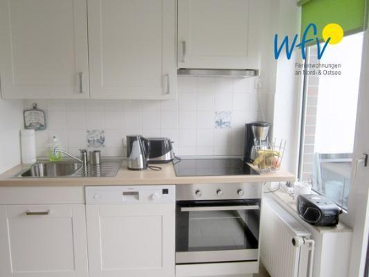 Für eine bequeme Selbstverpflegung in Ihrem Wangerooge-Urlaub verfügt die separate Küche u.a. über einen Herd mit Ceranfeld, einen Backofen, eine Mikrowelle und eine Spülmaschine.