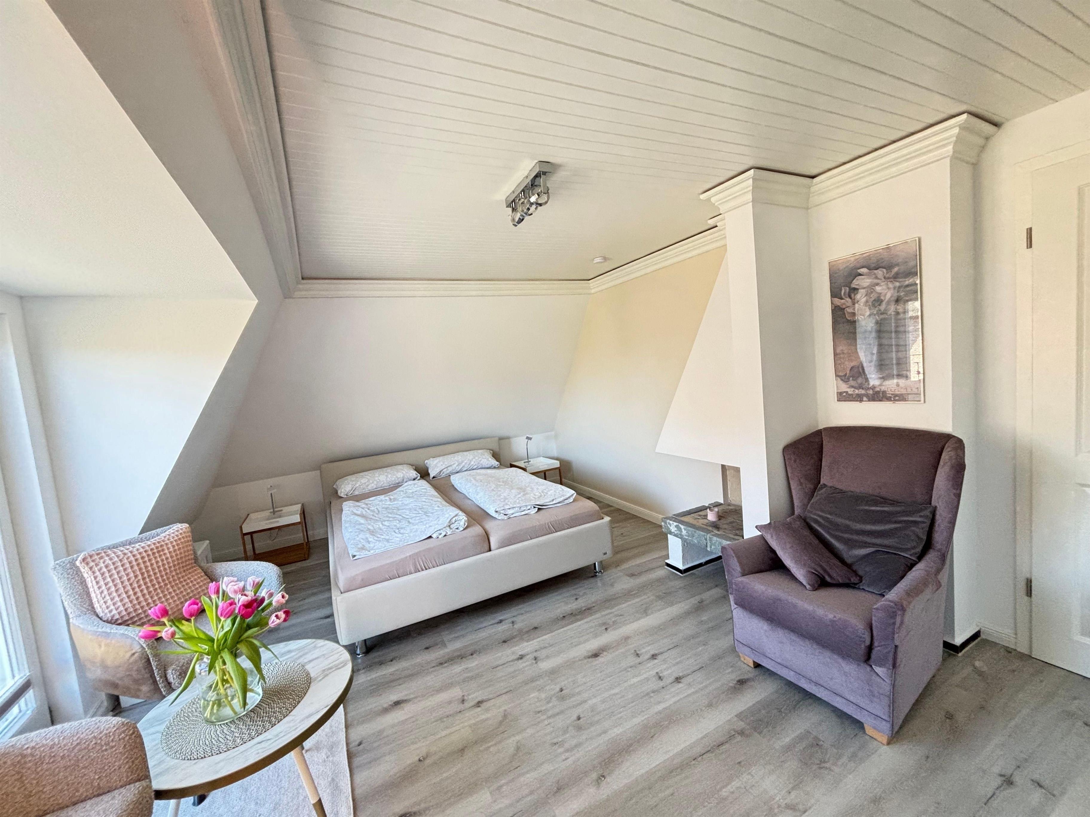 Die helle in ruhiger Lage liegende Wohnung im 1. OG verfügt über einen Wohn-/ Schlafraum mit Karmin, einem franz. Balkon, einer Küche mit Essecke. Modernes Bad mit Rain Shower Dusche. Eine Terrasse mit Strandkorb im Garten. Parken am o. neben dem Haus.