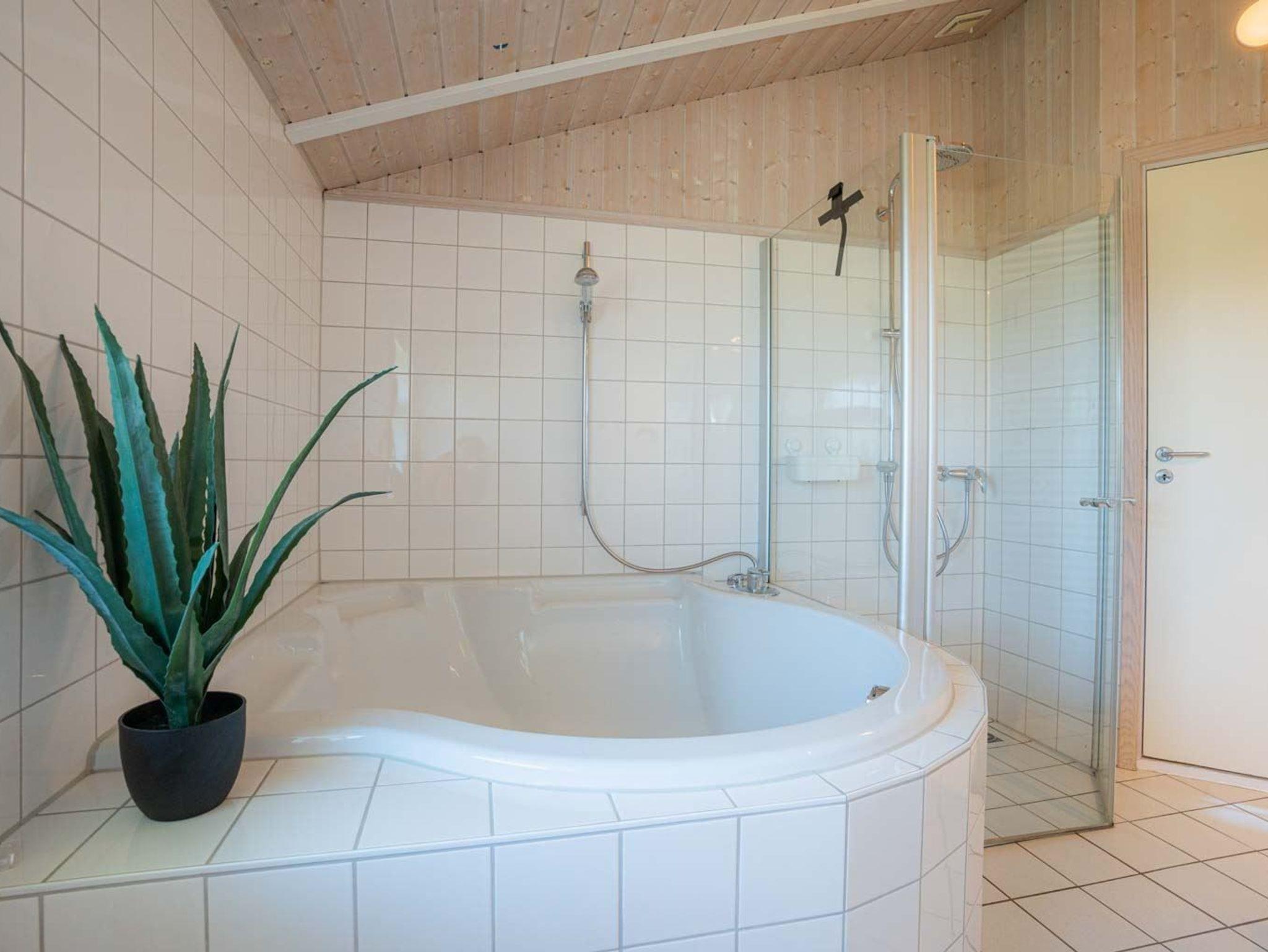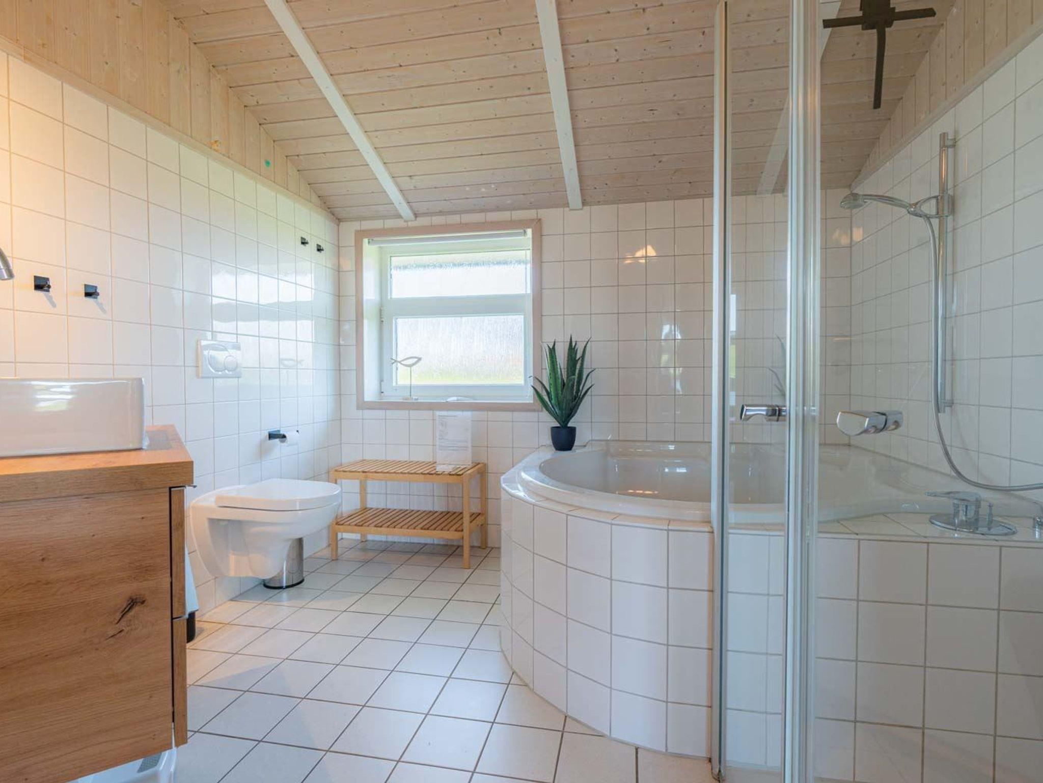 Badezimmer (Vollbad) mit bodengleicher Dusche, großer Badewanne mit Dusch-Handstück, WC, Handtuchwärmer, Tageslicht und Föhn.