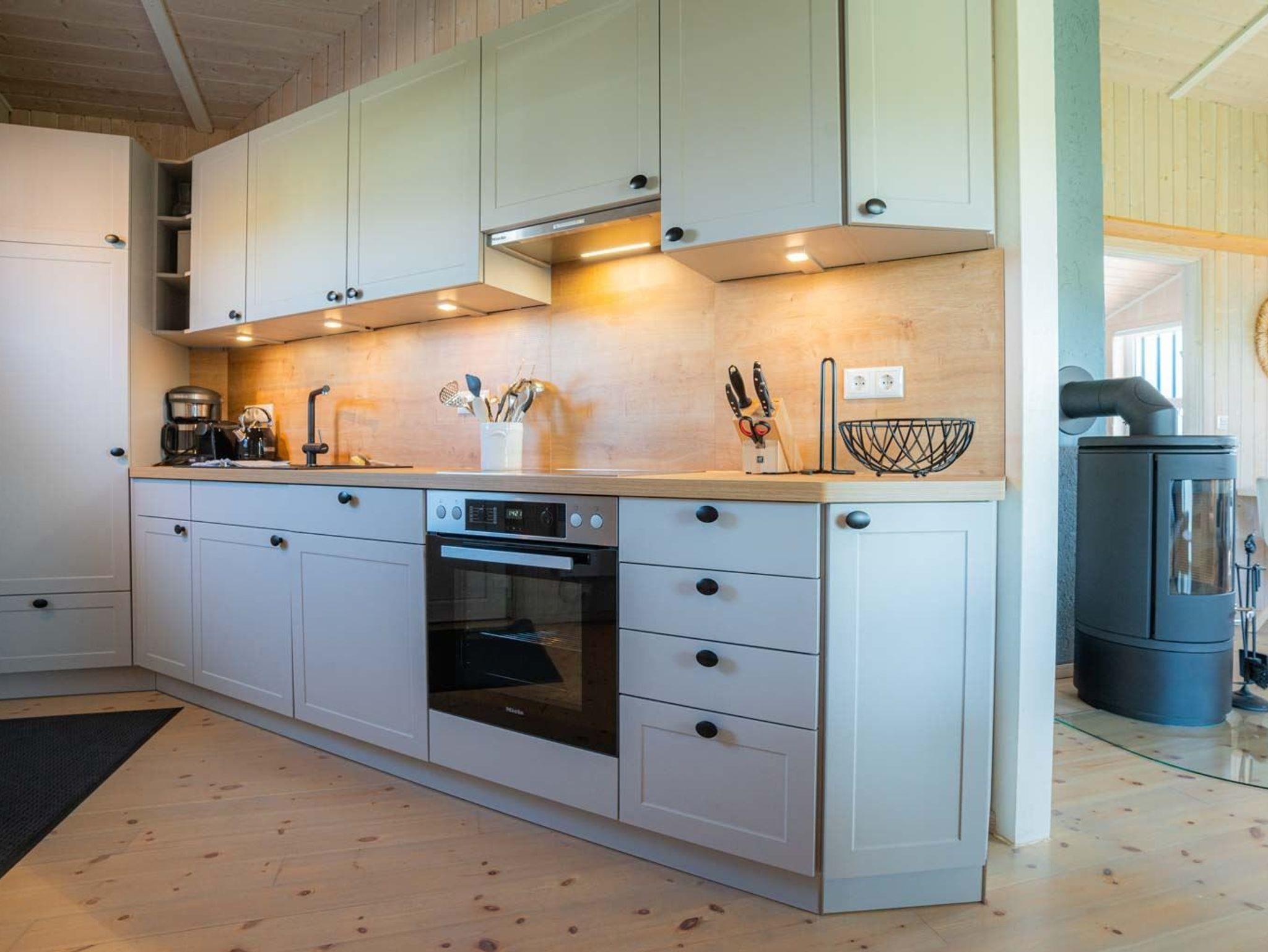 Offene Küche mit Backofen, Geschirrspüler, Kühlschrank mit Gefrierfach und Nespresso Kapsel-Kaffeemaschine. Abstellschrank mit Staubsauger und Bügelset.
