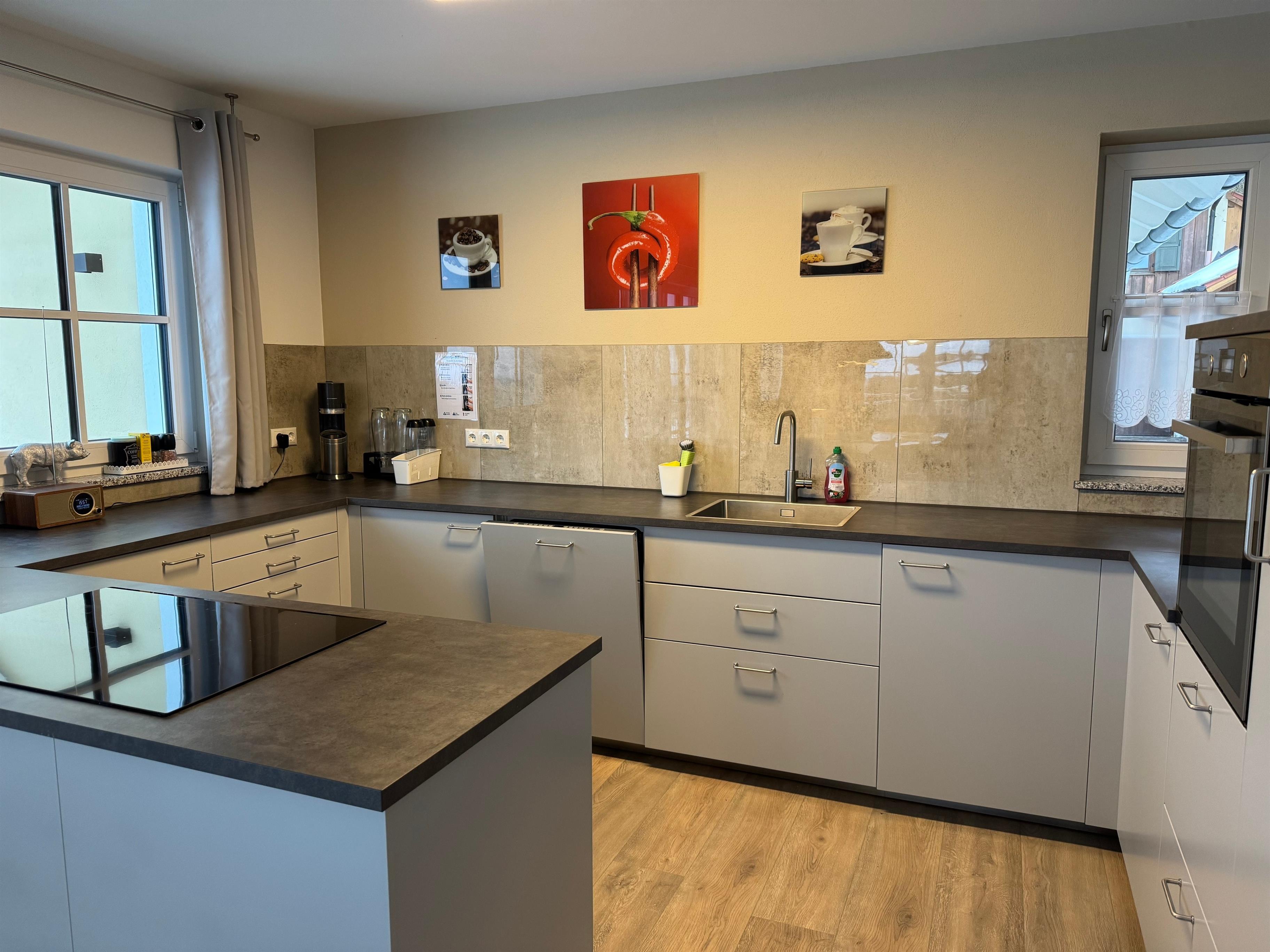Neue Küche mit neuen Elektrogeräten, Mikrowelle, Geschirrspüler (mit Tabs und Salz) und Kühl-Gefrierkombination