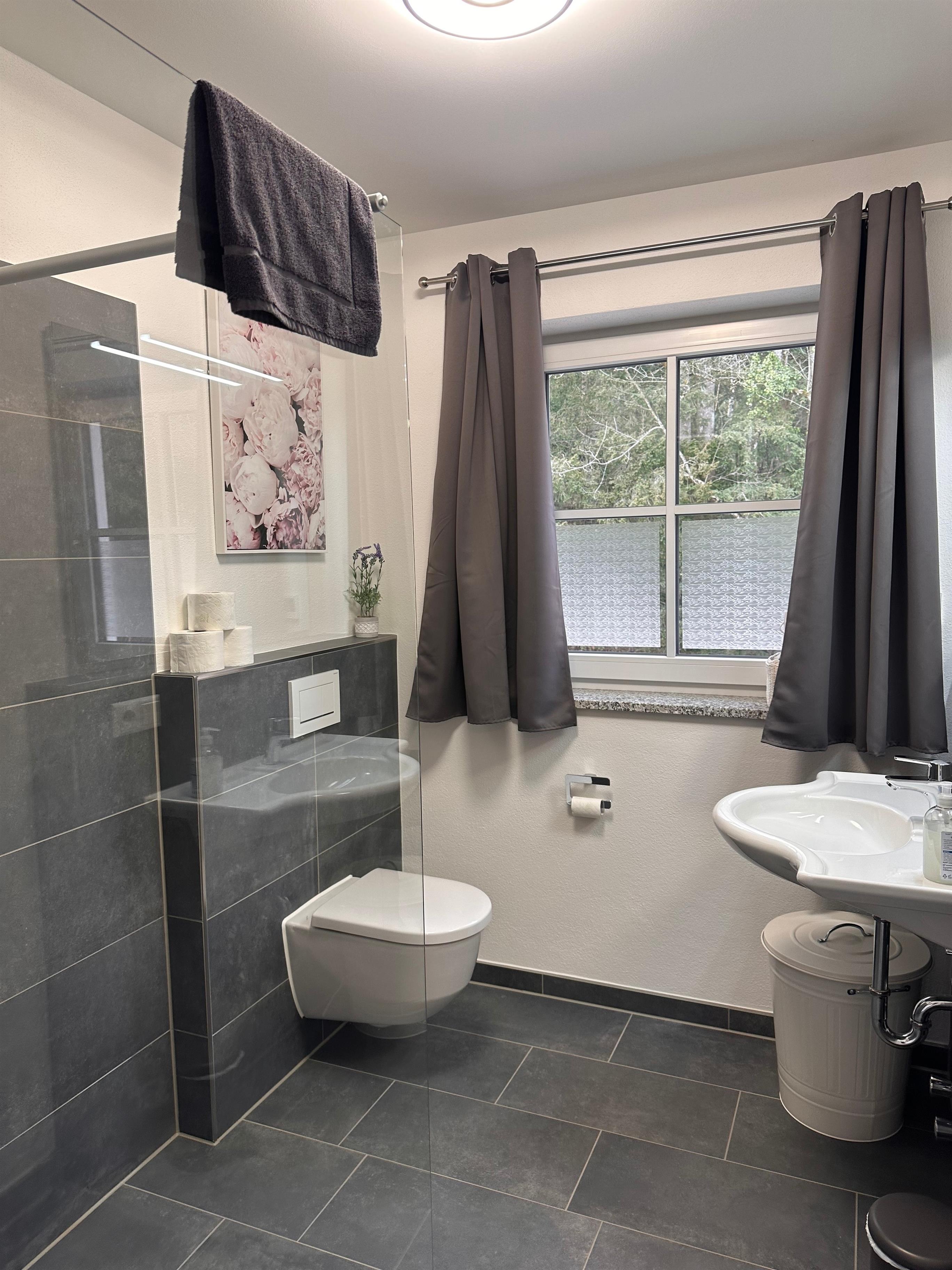 Ein Bad mit Walk-In Dusche, Toilette und Waschbecken