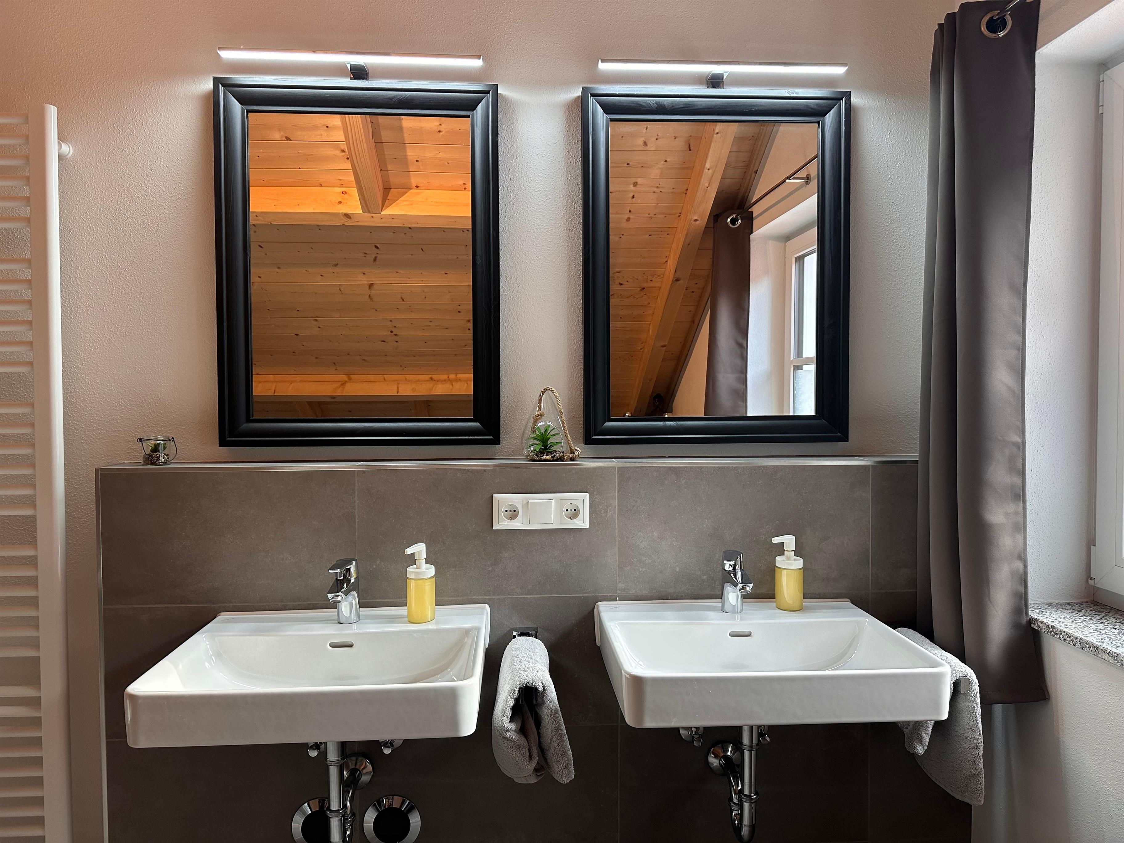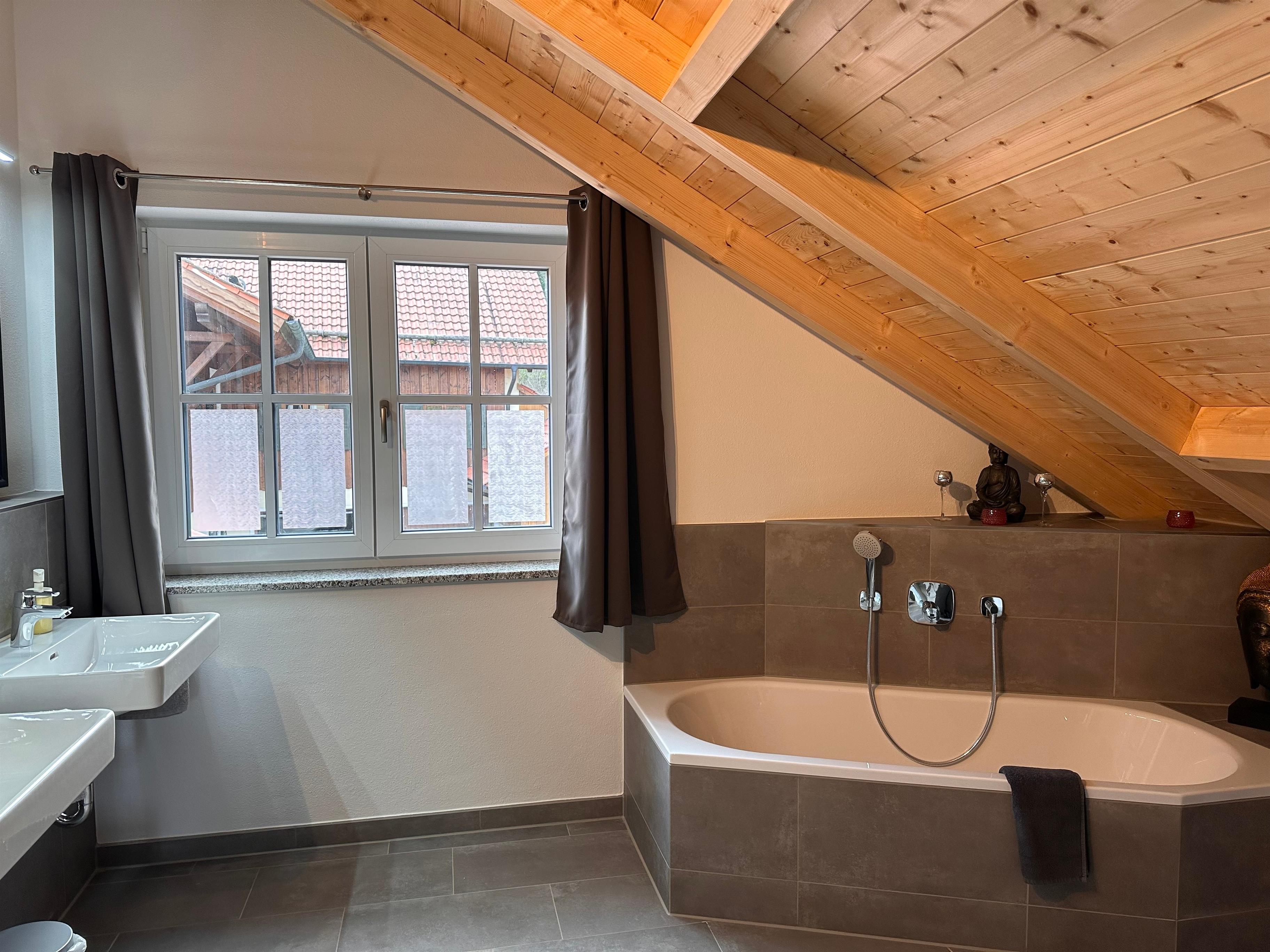 Ein Bad mit Badewanne, Walk in Dusche, Toilette und zwei Waschbecken