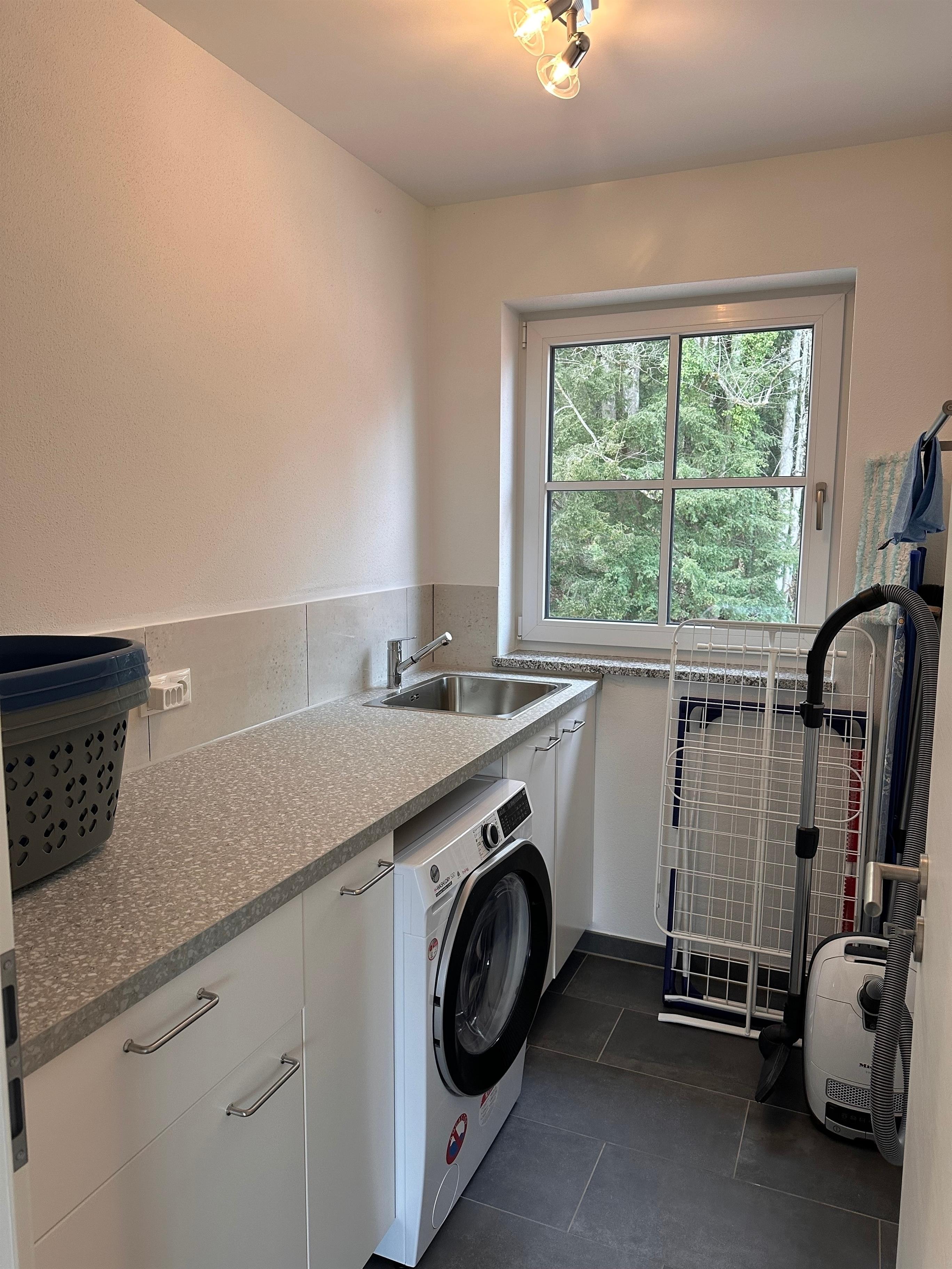 Eigener ausgestatteter Hausarbeitsraum mit Wasch-/Trockner, Wäscheständer, Bügelbrett und Bügeleisen