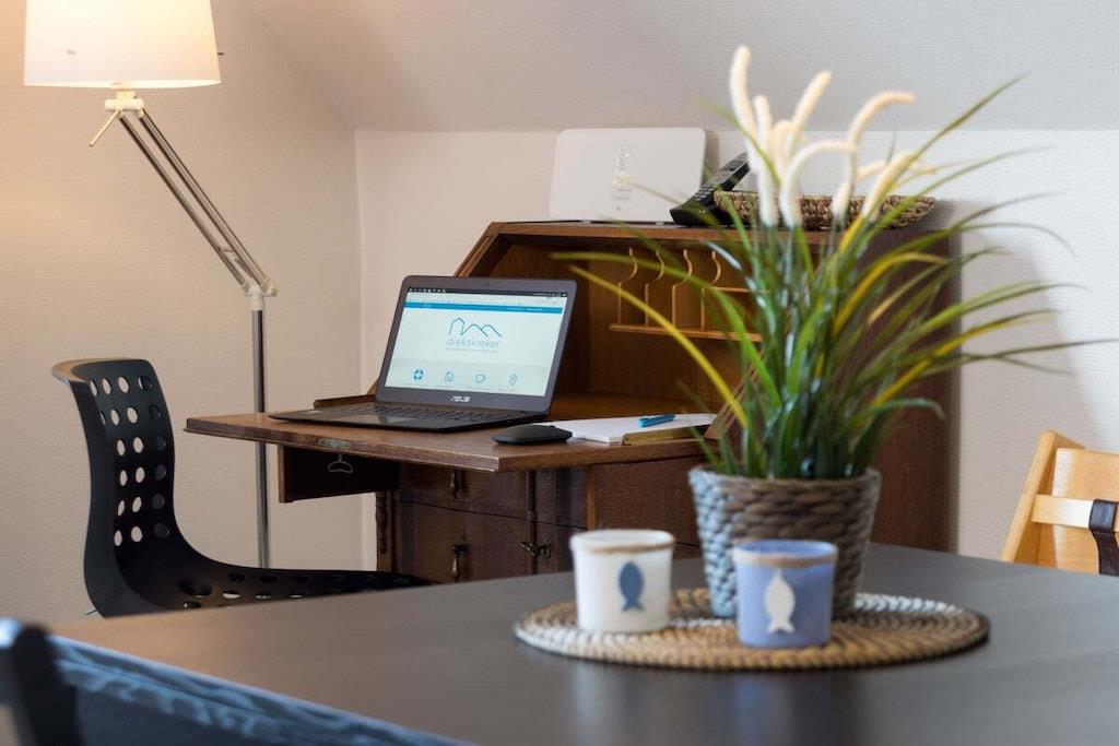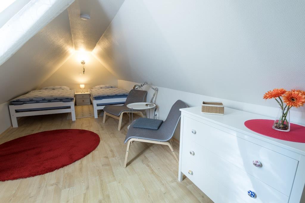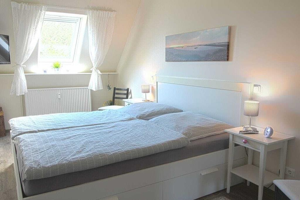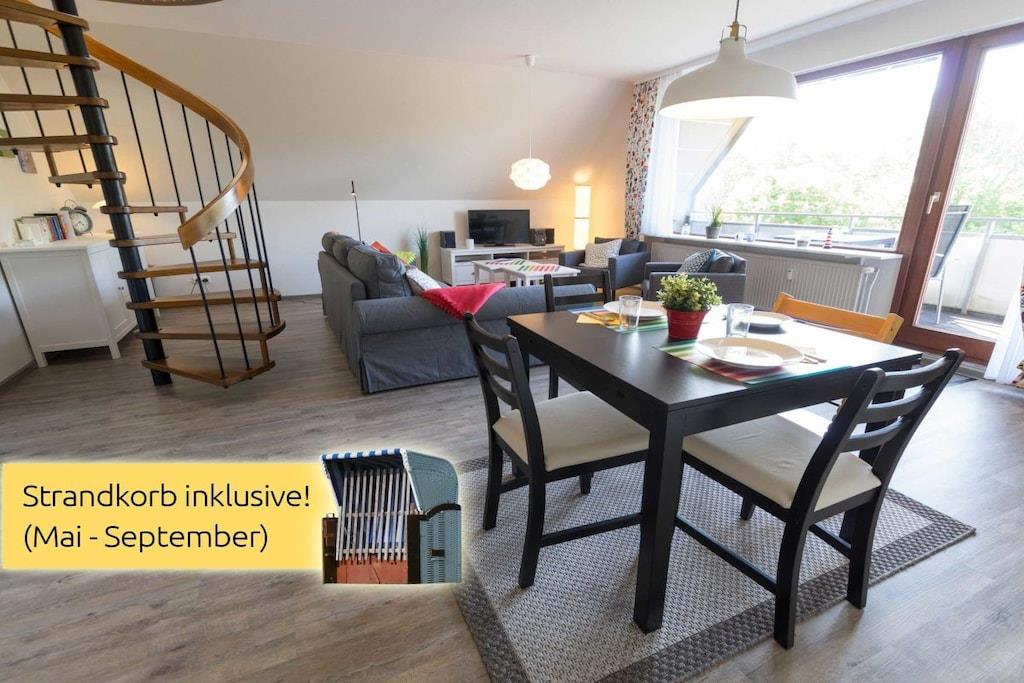 Ihre Ferienwohnung ist ca. 70m² groß, bietet optimalen Komfort für 4 Personen und ist u.a. mit einem Balkon ausgestattet. Wir haben Ihre Ferienwohnung im Frühjahr 2017 komplett renoviert und neu möbliert. Sie bietet ein geräumiges Wohn-Esszimmer mit großem Balkon und voll ausgestatteter offener Küche, ein separates Schlafzimmer und einen Spitzboden, den Sie über die charmante Wendeltreppe direkt vom Wohnraum aus erreichen, außerdem ein Duschbad und den Flur mit Garderobe. Vier Personen finden hier reichlich Platz. Einen kostenlosen Internetanschluss (WLAN) und Telefon mit Flatrate ins deutsche Festnetz stellen wir bereit. In den Monaten Mai - September ist ein Strandkorb an der Badestelle Stinteck inklusive! In der Wohnung steht Ihnen eine Waschmaschine mit Trockner zur Verfügung.