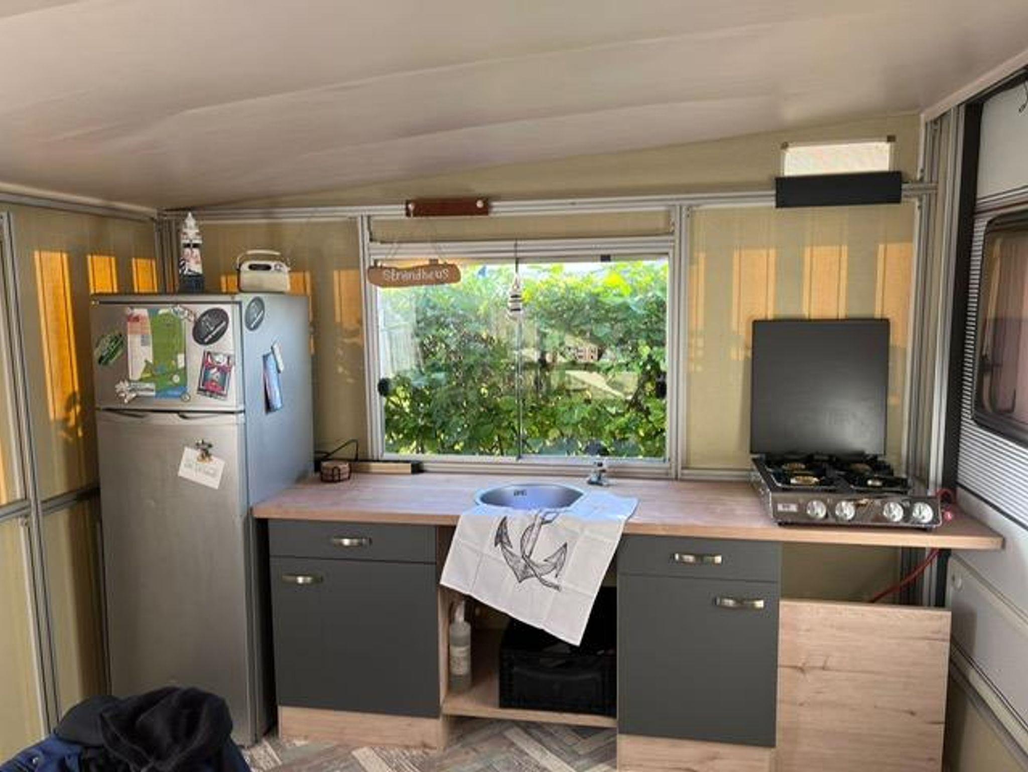 Im Vorzelt befindet sich die Küche mit Gasherd und Kühlschrank und einer Ess-Ecke.
