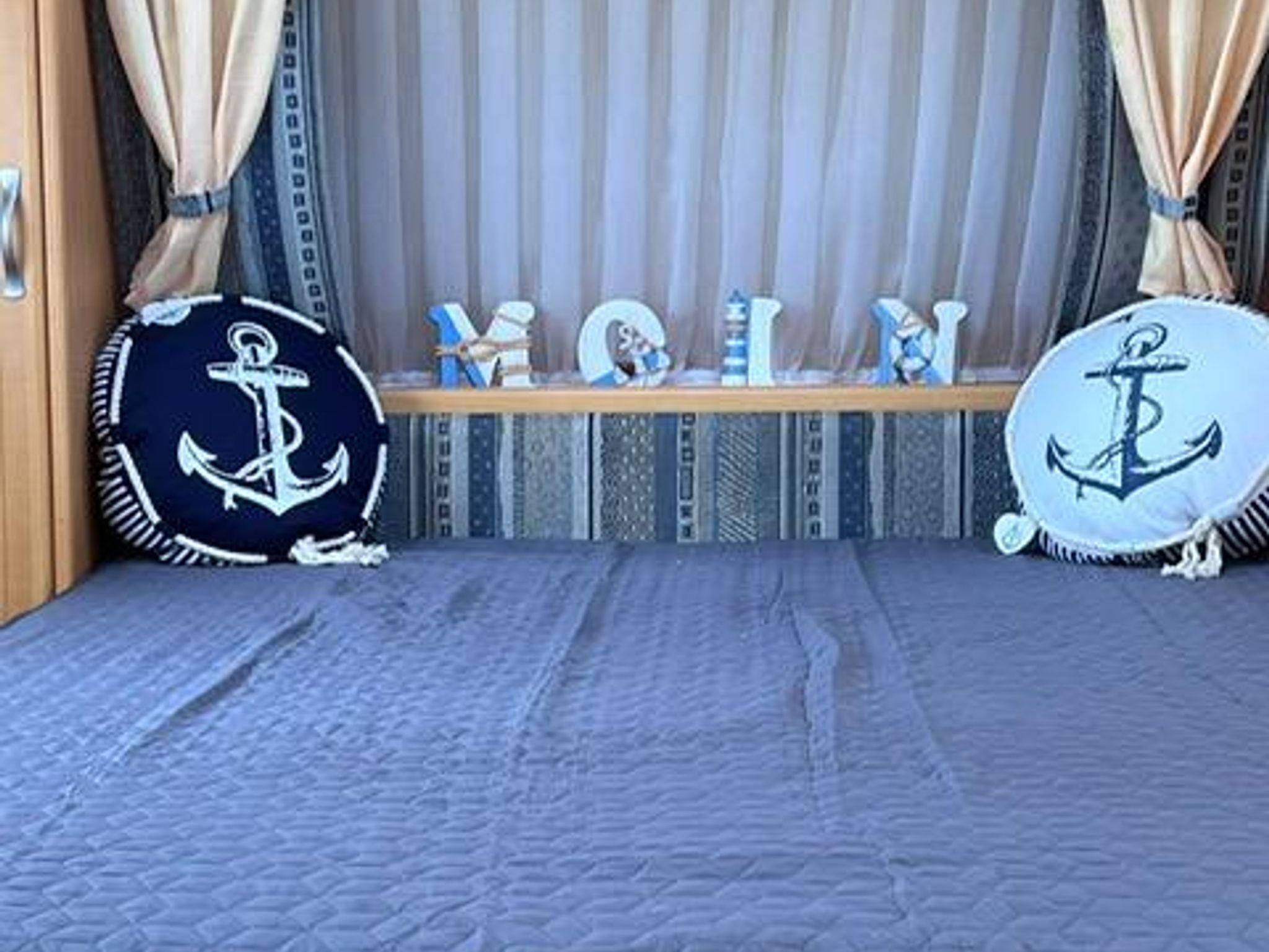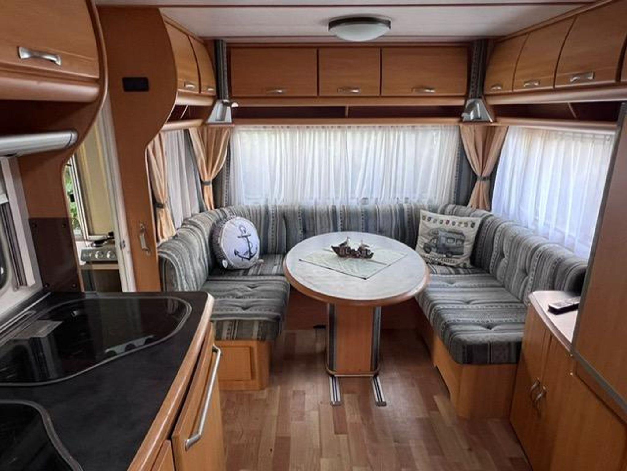 Im Wohnwagen befindet sich ein Festbett (2m x 1,4m) das Platz für zwei Personen bietet und eine Rundsitzgruppe, die bei Bedarf auch noch zu einem Bett umgebaut werden kann. Viele kleine Fächer und ein Kleiderschrank bieten genug Platz für Ihre Sachen.