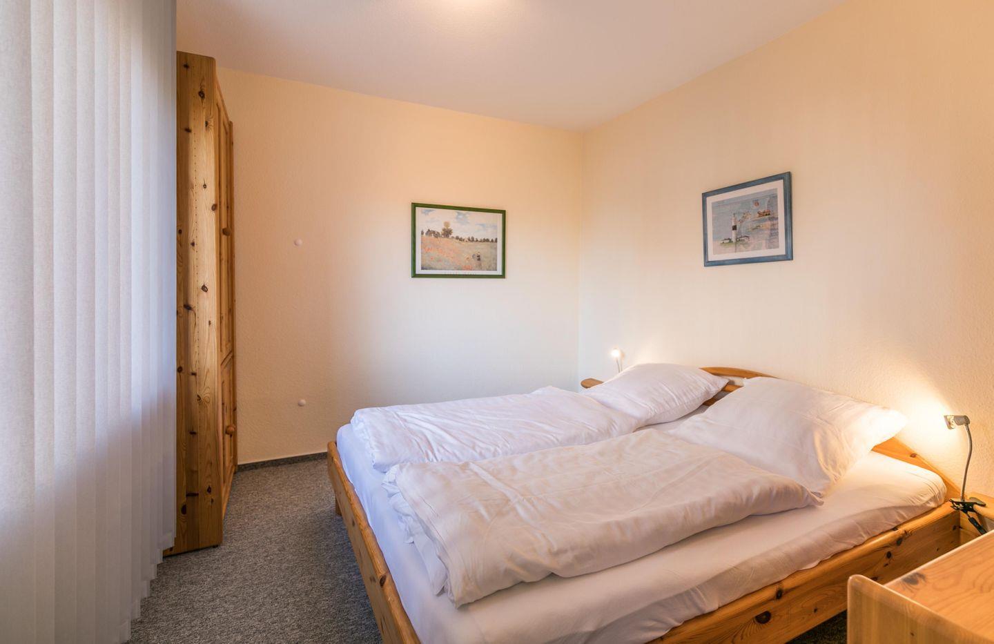 Doppelbett 200 cm x 180 cm (je Matratze 90 cm, Betthöhe 50 cm), verstellbare Lattenroste (Kopf- und Fußteil), Kleiderschrank 2-türig, Kommode, Fenster mit Vertikaljalousie