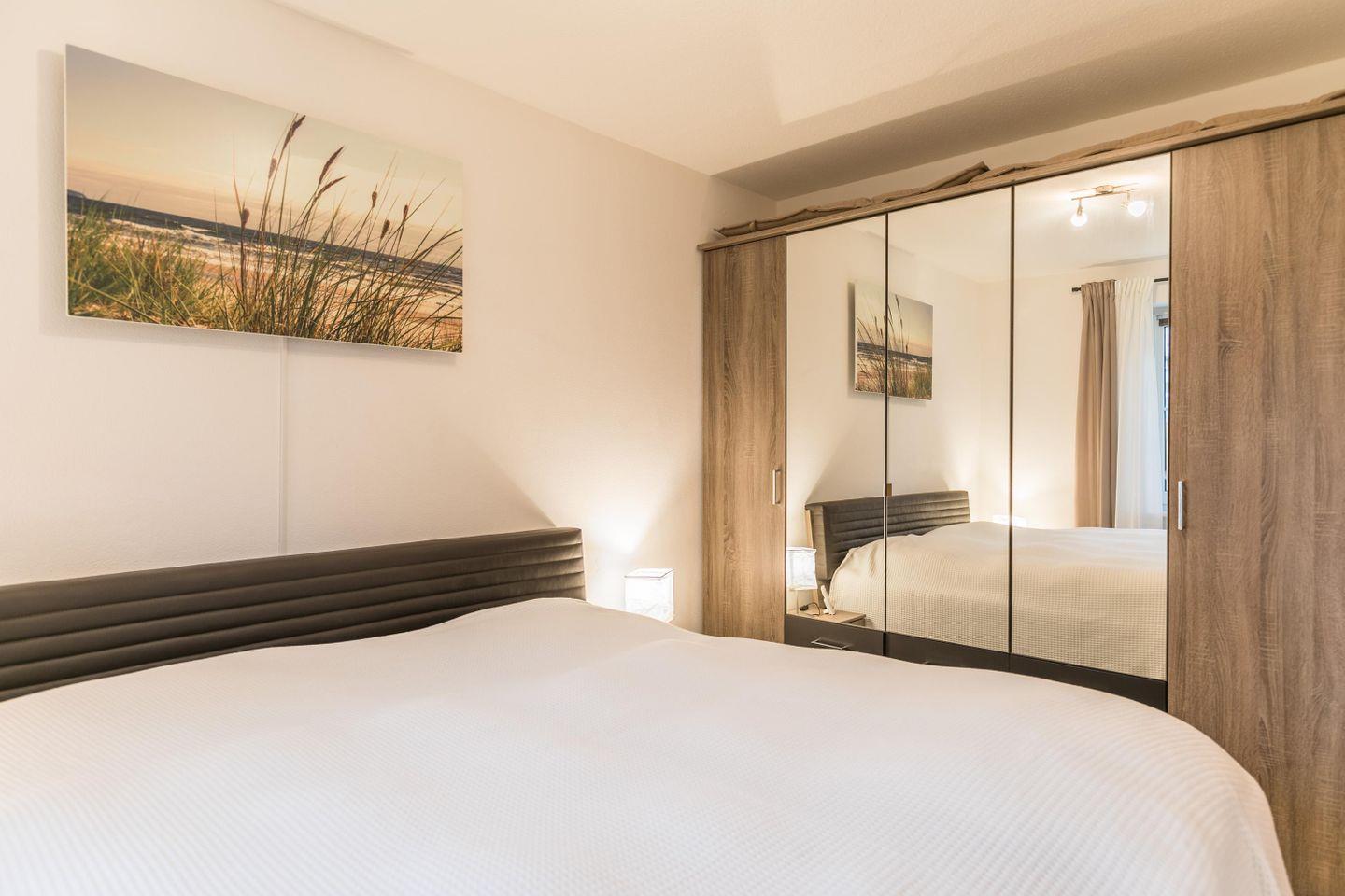 Doppelbett mit getrennten Matratzen (je 200x 90x 55 cm), Nachttische + Lampen, Kleiderschrank 5-türig mit Ganzkörperspiegel, Verdunkelungsrollos und Vorhang, Fliegengitter