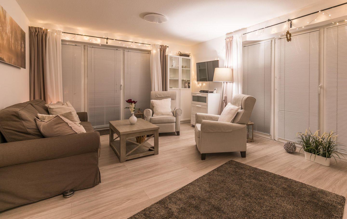 Couch, 2 Sessel, Flachbild-TV, Blu-Ray-Player, Kommode, Schrank, Leselampe, Zugang zur West-Terrasse, Tisch und Bar-Stühle, Vorhang, Fliegengittertür