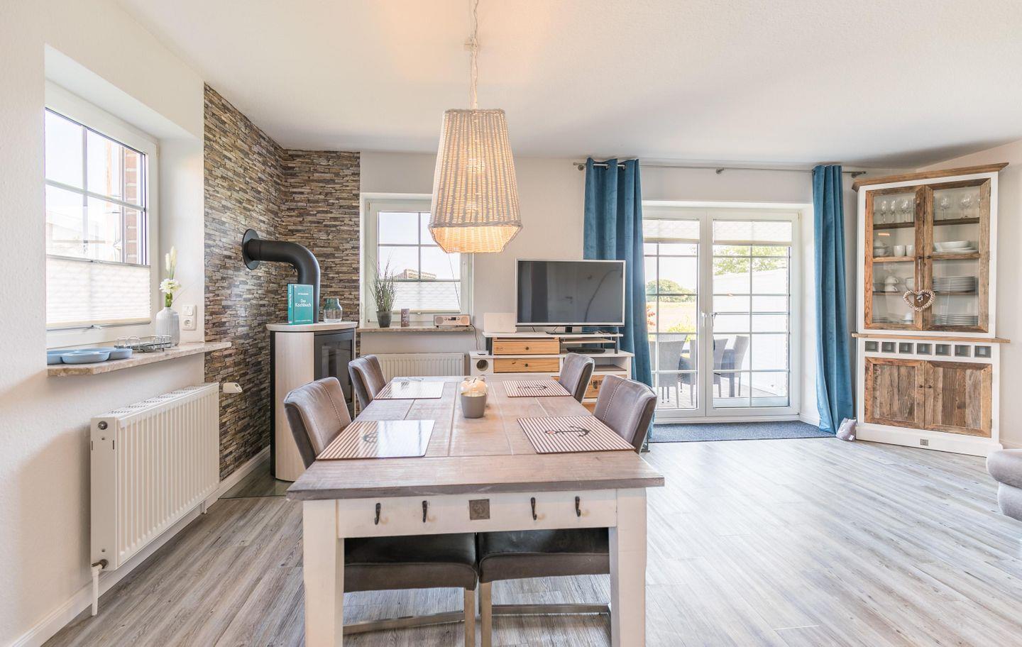 Moderne Ferienwohnung mit maritimem Flair, Terrasse und Kaminofen nahe Büsum – ideal für Erholung und kleine Hunde.