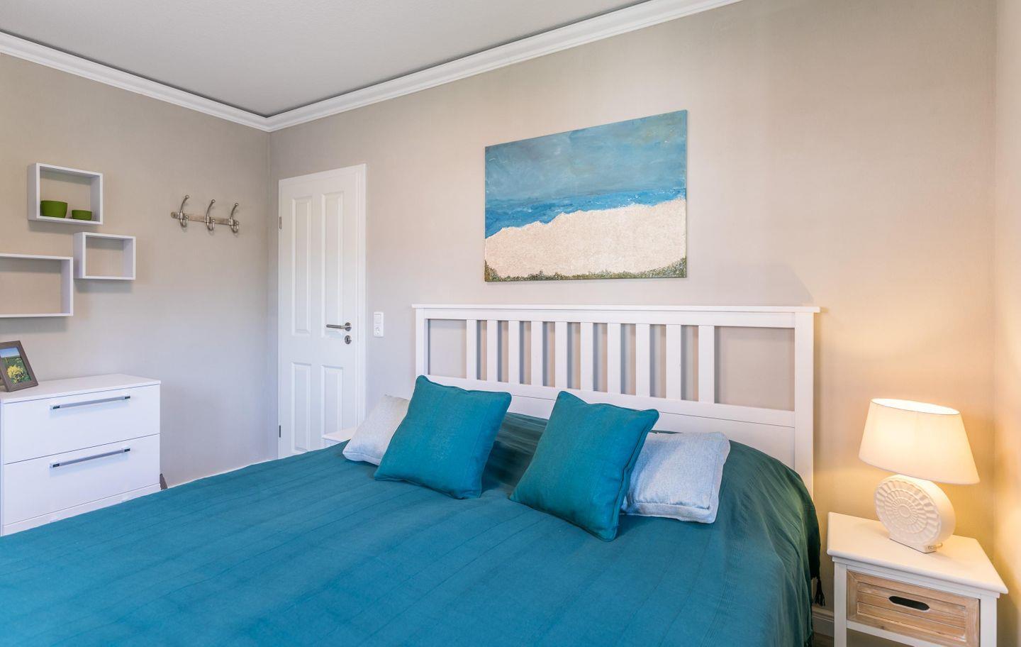 Doppelbett (je 0,90x2,00m), verstellbare Lattenroste, Kleiderschrank, Nachtkonsolen + Lampen, Außenrollläden