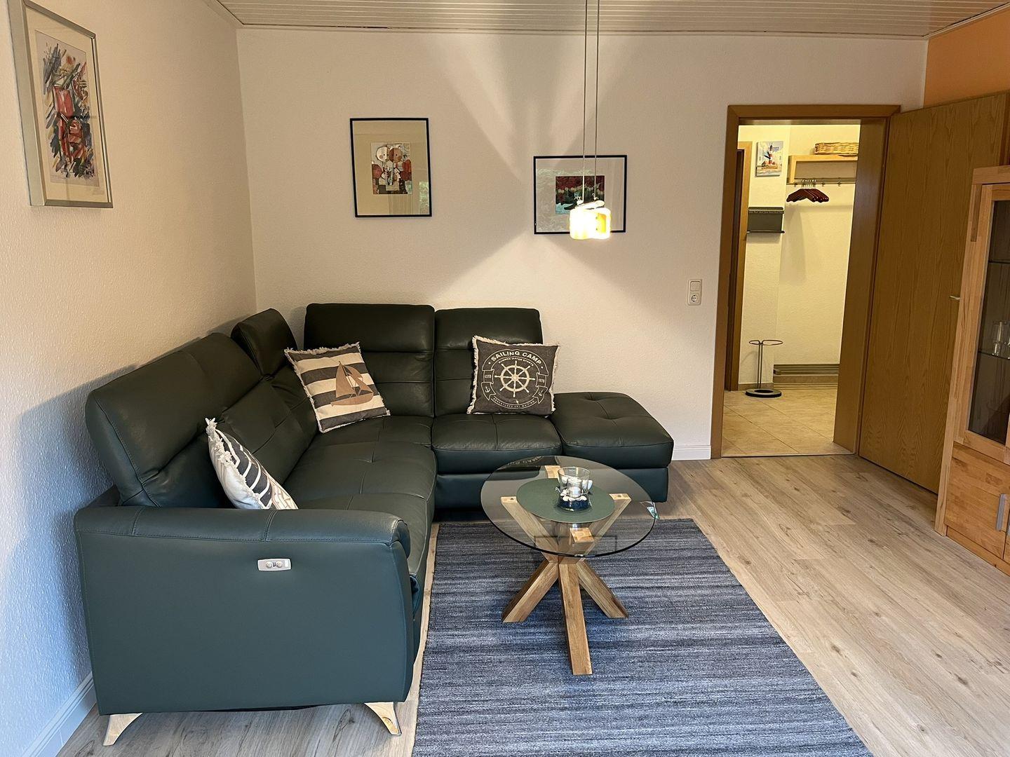Das gemütliche Wohnzimmer ist mit einer bequemen Ledercouch ausgestattet, die genug Platz zum Faulenzen bietet. Von dort erreicht man die große Terrasse auf der man herrliche Stunden verbringen kann.