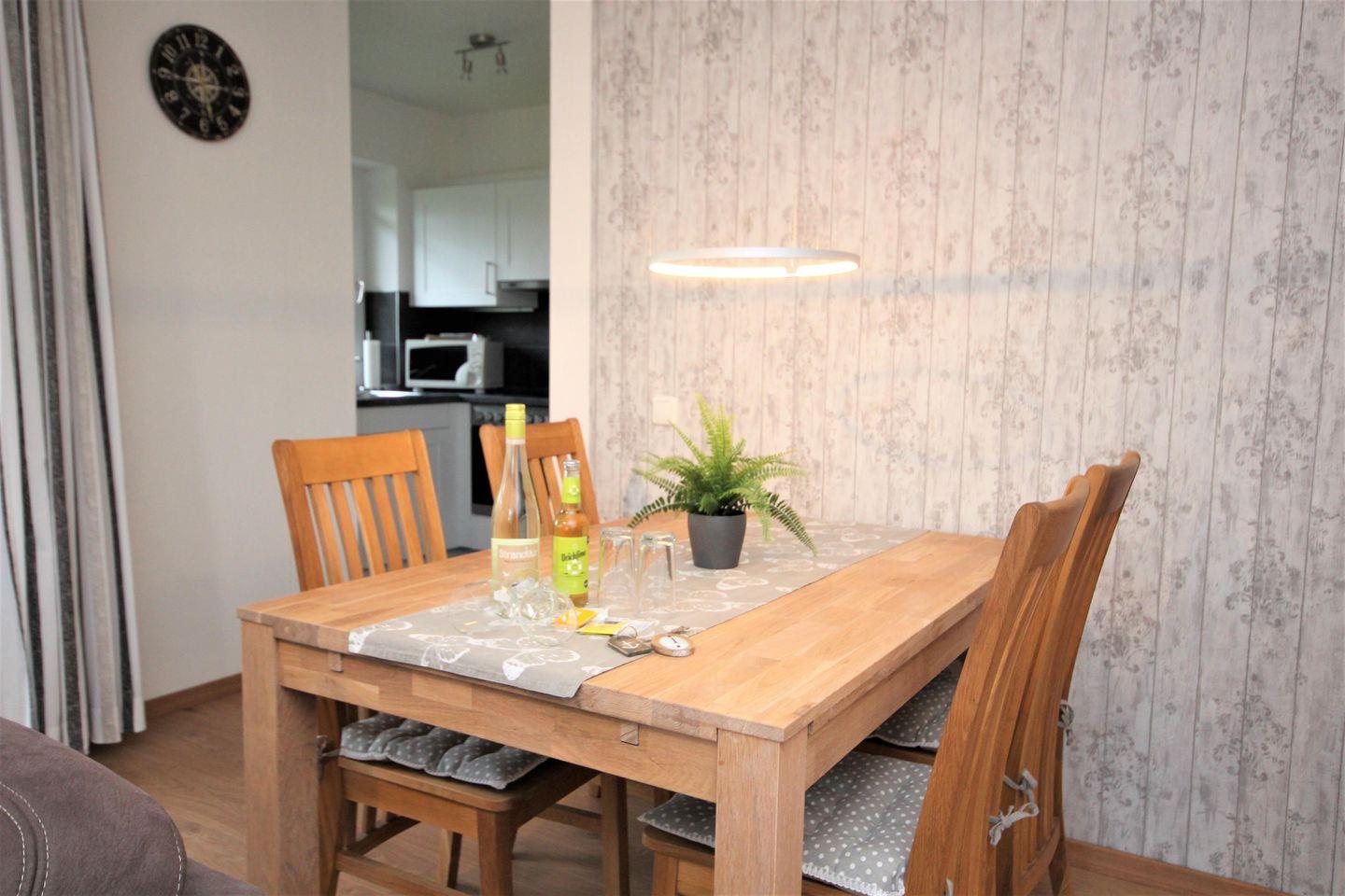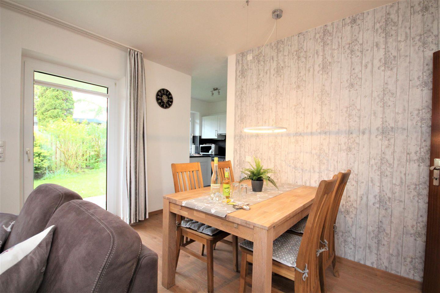 Der große, sehr geschmackvoll, eingerichtete Wohnraum- Essraum lädt zum verweilen ein, wenn das Wetter mal nicht ganz so schön ist. Ein TV- Gerät, CD- und DVD Player gehören hier zur Ausstattung.