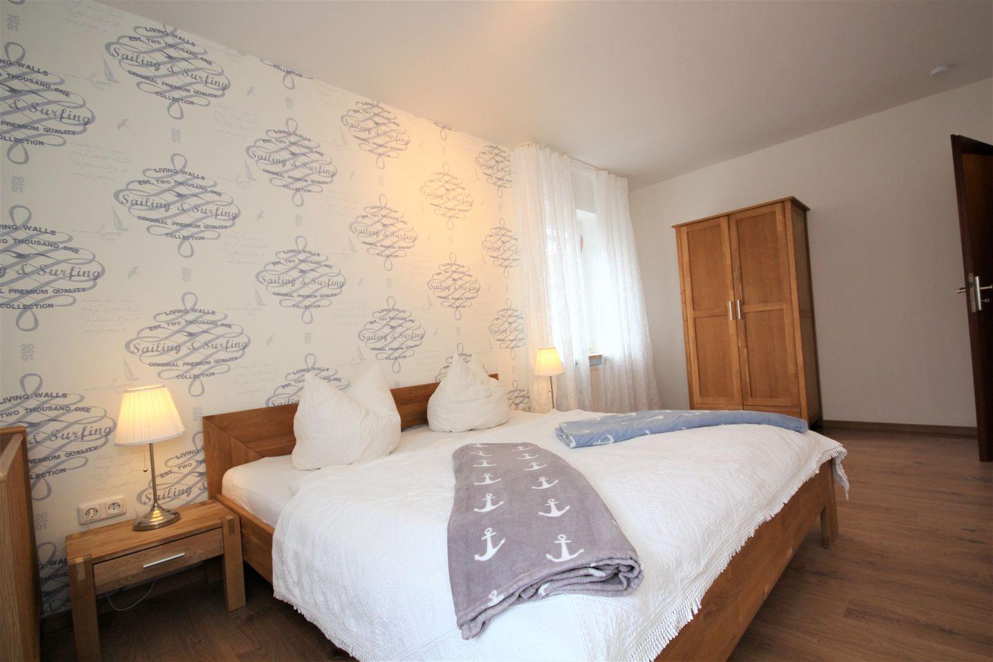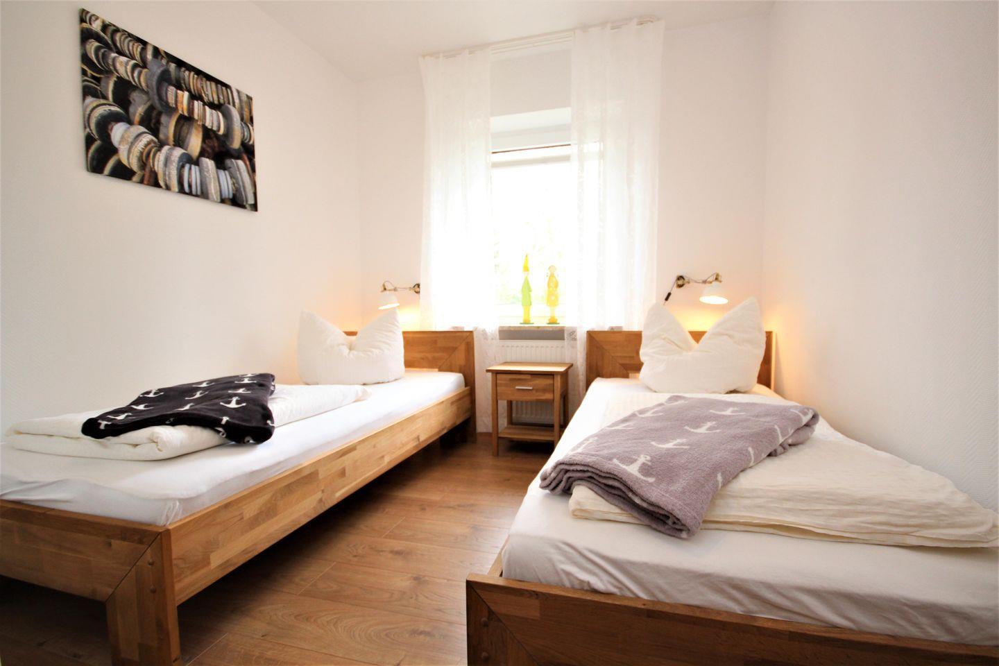 Von den 2 Schlafräumen ist eines mit einem Doppelbett ( 2 Einzelmatratzen) und das andere mit 2 Einzelbetten eingerichtet. Platz für ihre Urlaubsgarderobe gibt es ausreichend. Ein Kinderbett für kleine Gäste (bis 2 Jahre) steht kostenfrei zusätzlich bereit.