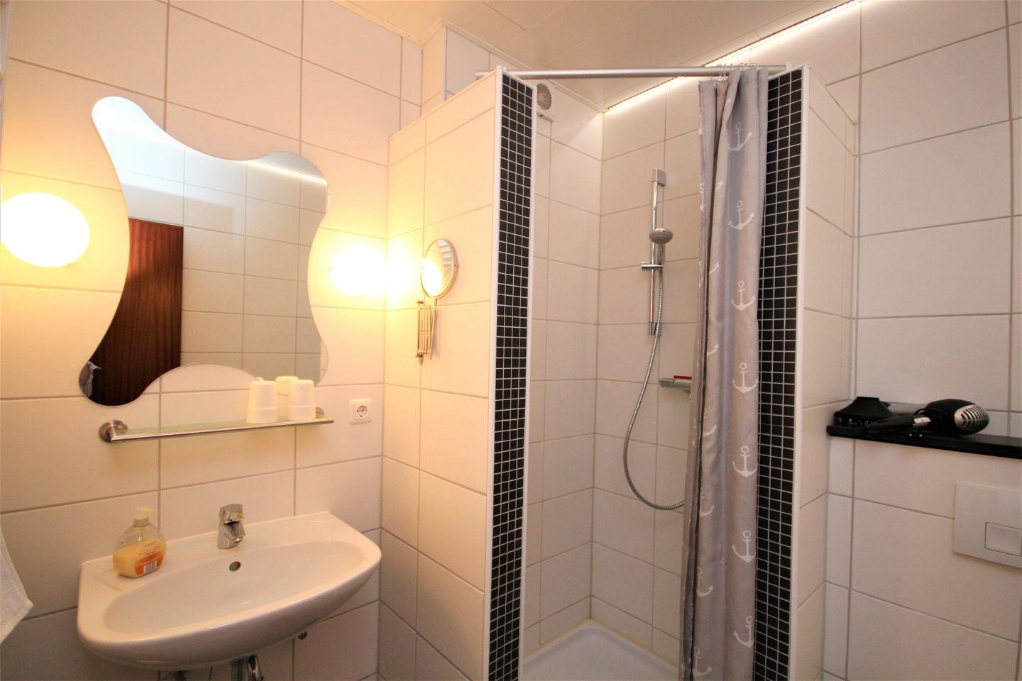 Das Badezimmer mit Dusche, Handtuchwärmer und Föhn ist, wie der Rest der Wohnung ,schick und modern.