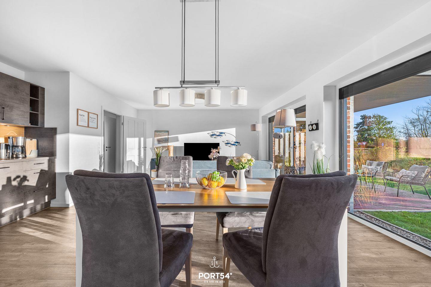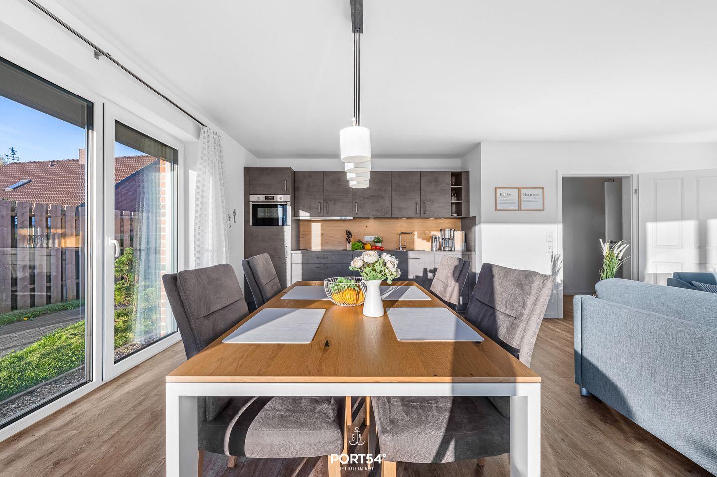 Der großzügige, offen gestaltete Wohn- und Essbereich bildet das Herzstück der Wohnung. Eine gemütliche Sofaecke mit Sofa, Sessel und TV lädt zum Entspannen ein, während Bücher und Gesellschaftsspiele für unterhaltsame Stunden sorgen. Am großen Esstisch kannst du gemeinsam essen, spielen oder den Tag gemütlich ausklingen lassen.