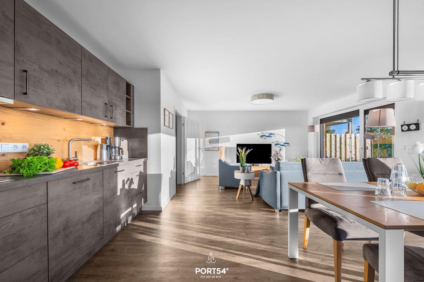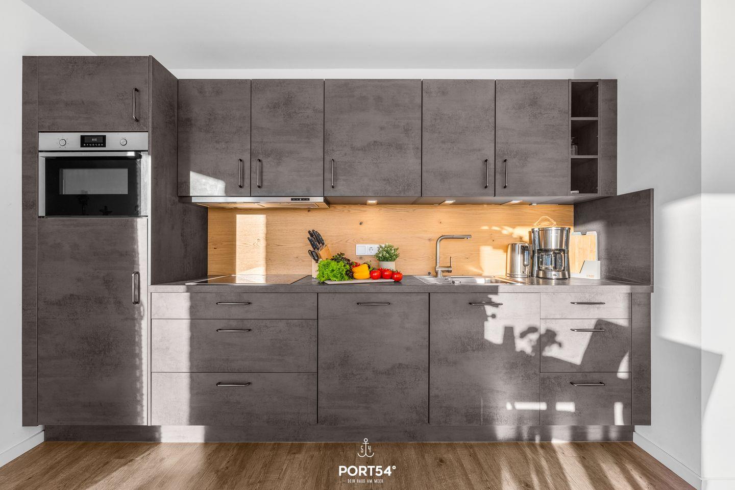 Die offene Küche ist umfassend ausgestattet und lässt kaum Wünsche offen. Zur Ausstattung gehören unter anderem Induktionsherd, Backofen, Mikrowelle, Kühlschrank mit Gefrierfach, Spülmaschine, Kaffeemaschine, Cafissimo-Espressomaschine, Wasserkocher und Toaster. Geschirr, Besteck und Küchenutensilien stehen selbstverständlich ebenfalls zur Verfügung.