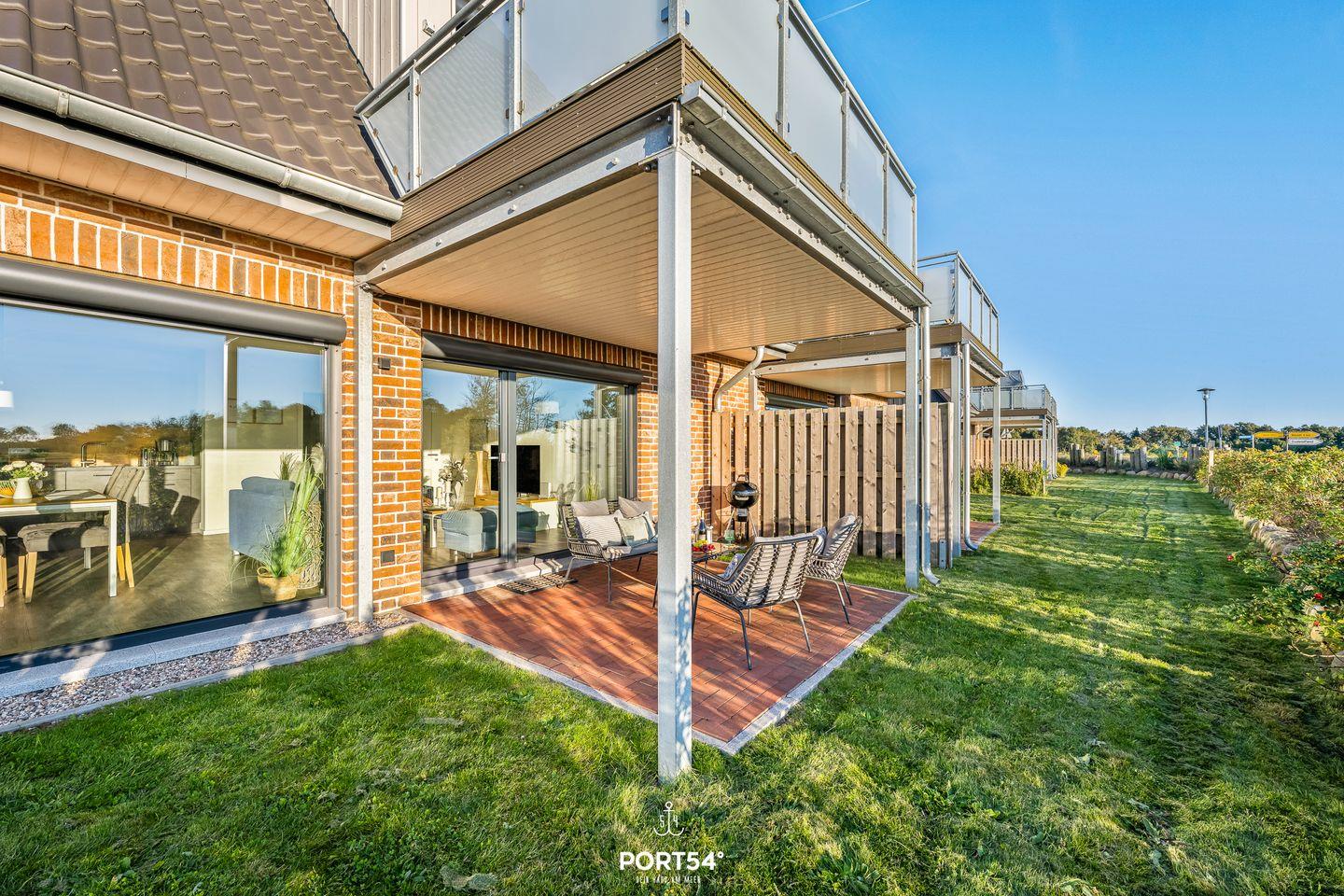 Vom Wohnbereich gelangst du direkt auf die teilweise überdachte Terrasse. Hier genießt du von morgens bis abends die Sonne und einen besonders schönen Blick über den Nordgrovenkoog – Natur, Ruhe und Weite inklusive. Gartenmöbel, Sonnenliegen und ein Kohlegrill stehen dir ebenfalls zur Verfügung.