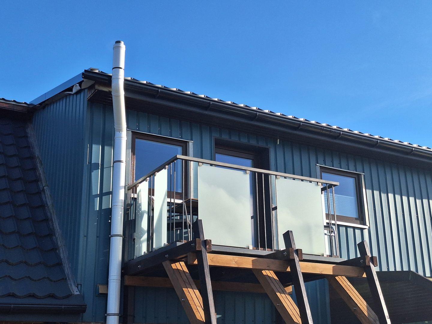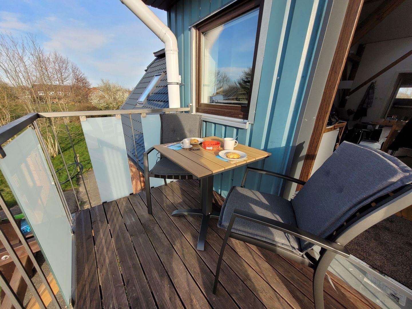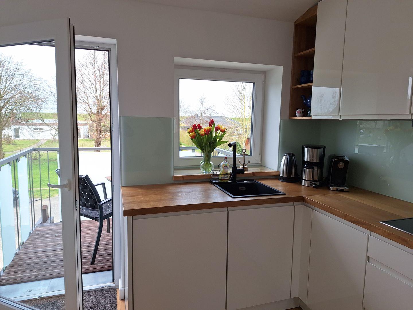 Von der Küche aus kommen Sie auf den sonnigen Balkon, von wo Sie einen tollen Blick auf den Deich haben.