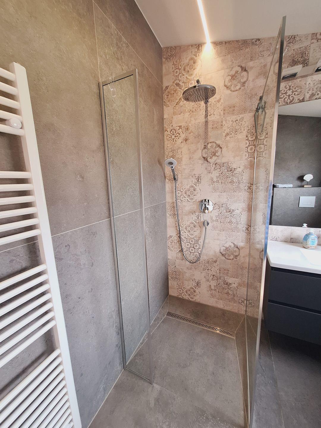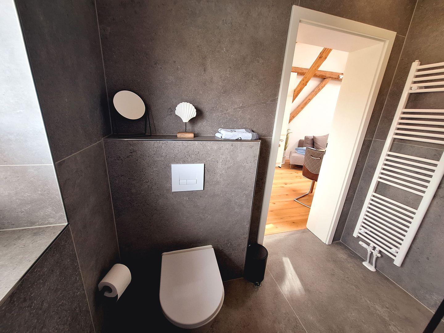 Ein weiteres Highlight ist das schicke Tageslichtbad mit bodengleicher Regendusche und Handtuchwärmer. Eine richtige kleine Wohlfühloase.
