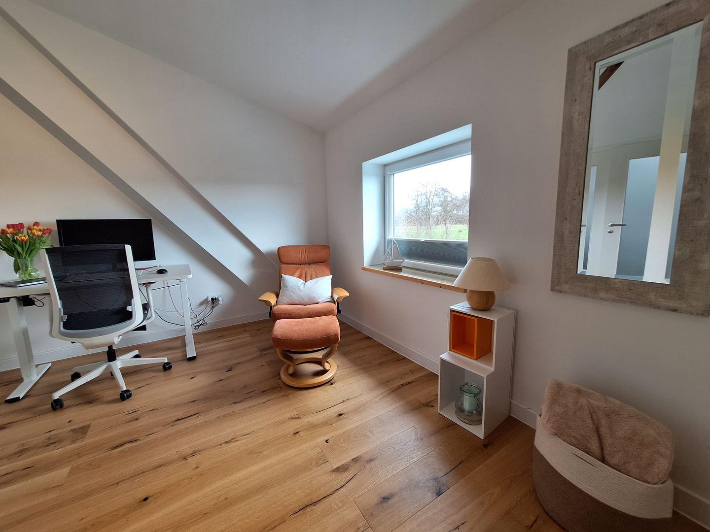 Das Schlafzimmer ist mit einem hochwertigen Boxspringbett (1,80mx 2m mit Einzelmatratzen & durchgehender Topper), einem großen, geräumigen Schrank eingerichtet, zusätzlich finden hier noch noch einen Stressless- Sessel mit Hocker zum Entspannen und einen Schreibtisch (höhenverstellbar) mit Monitor, der mobiles Arbeiten ermöglicht.