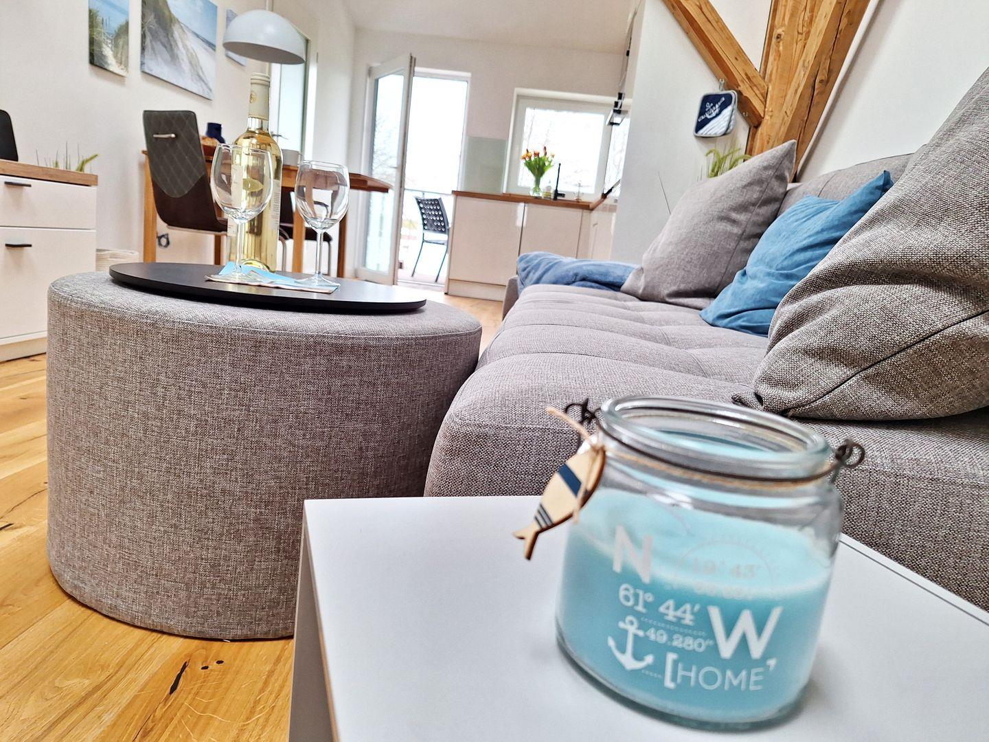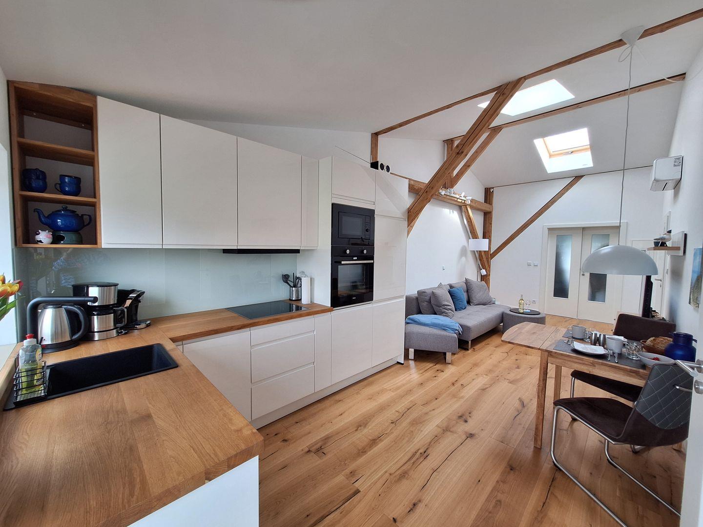 Es erwartet Sie ein heller, offener Wohnbereich der durch seine hohe Decke, den sichtbaren Balken und den beiden Dachfenstern, sehr besonders ist. Ein gemütliches Sofa lädt zum Entspannen ein.