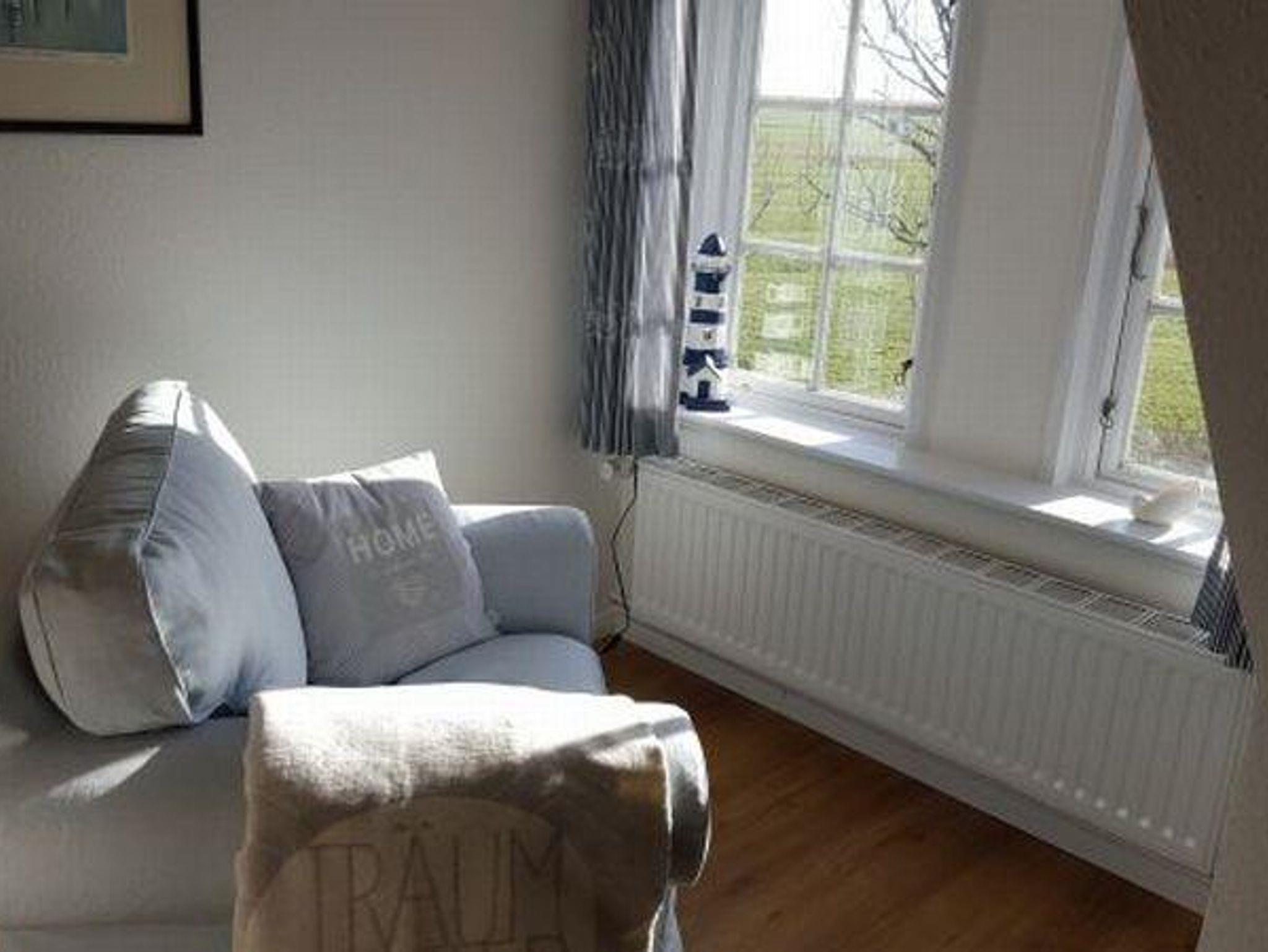 Die großzügige Dachwohnung ist ca. 100 qm groß und für 4 - 5 Personen geeignet. Durch das große Gaubenfenster mit Austritt nach Westen haben Sie einen großartigen Blick über die Wiesen zum Kirchturm und natürlich zum Leuchtturm. Die 4 Schlafkammern mit jeweils einem Gaubenfenster, sind zwar klein aber kuschelig. Im hellen Wohnraum befindet sich die Sitzecke mit lässigen Sitzmöbeln und Kaminofen. Im großen Küchenbereich mit Spülmaschine und freistehendem Kühlschrank lädt der große Esstisch zu schönen Gemeinschaftserlebnissen ein.