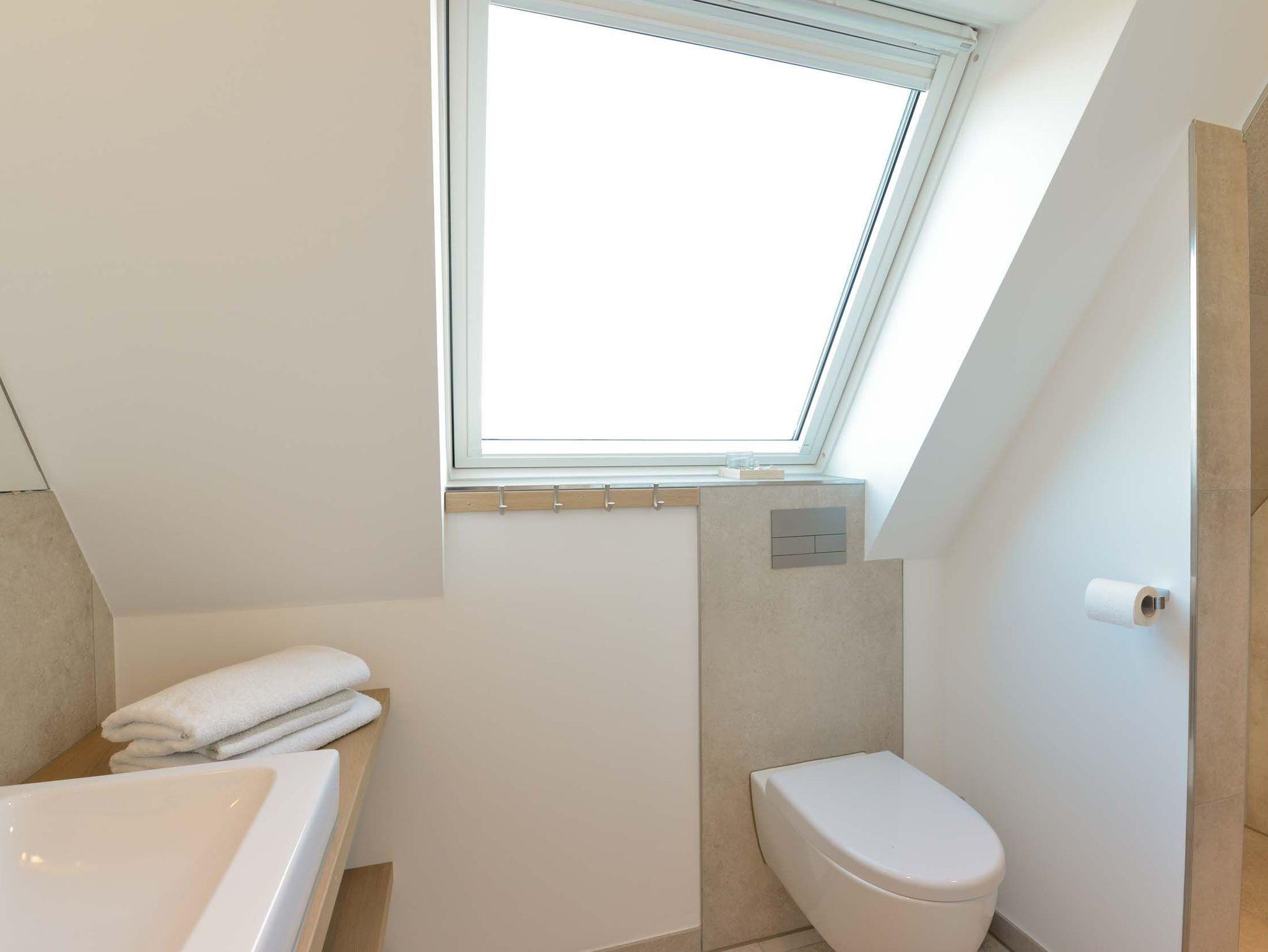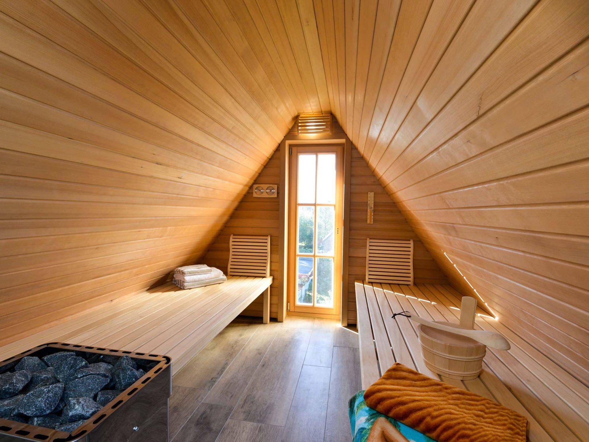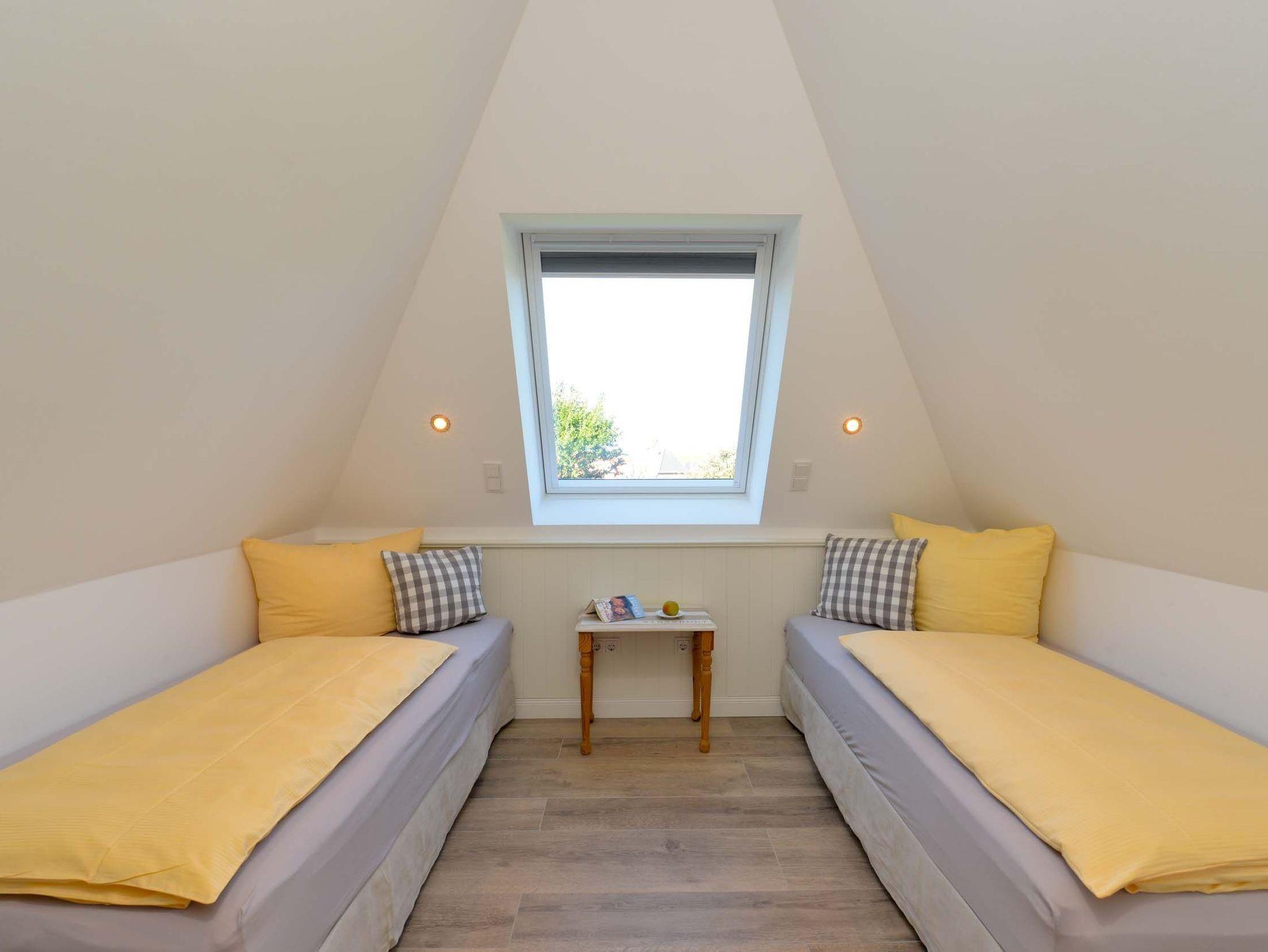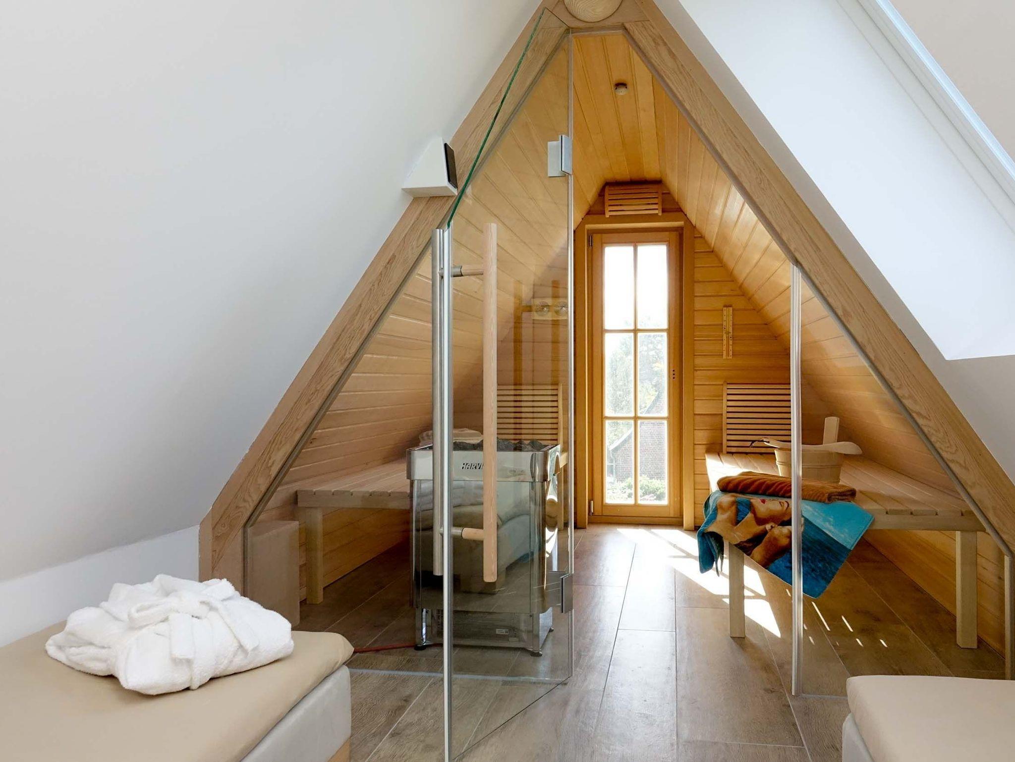 Im Spitzboden gibt es ein weiteres Schlafzimmer mit zwei Einzel-Boxspringbetten, die auf Wunsch zusammengestellt werden können. Auch hier gibt es ein Duschbad sowie eine Sauna.