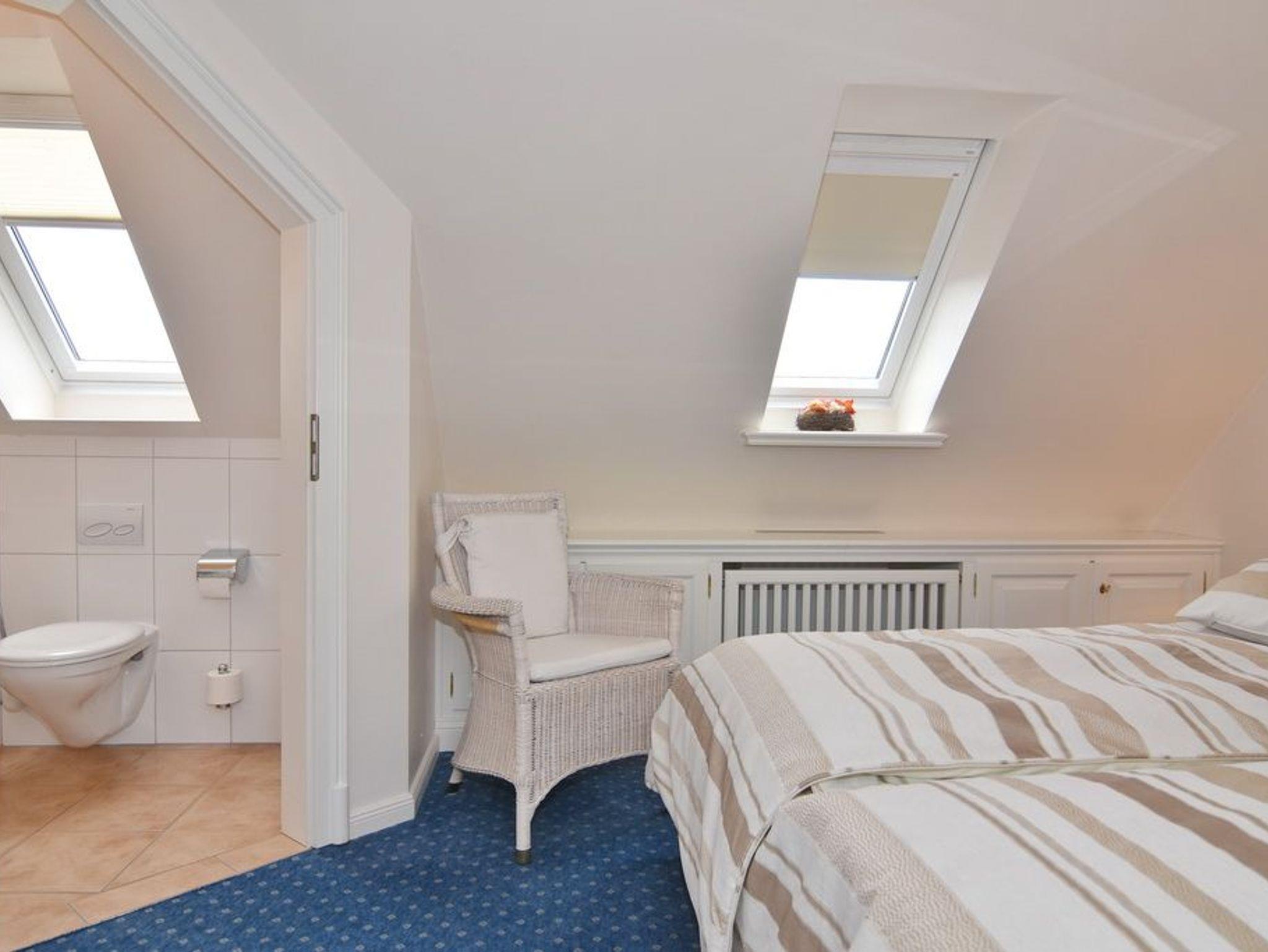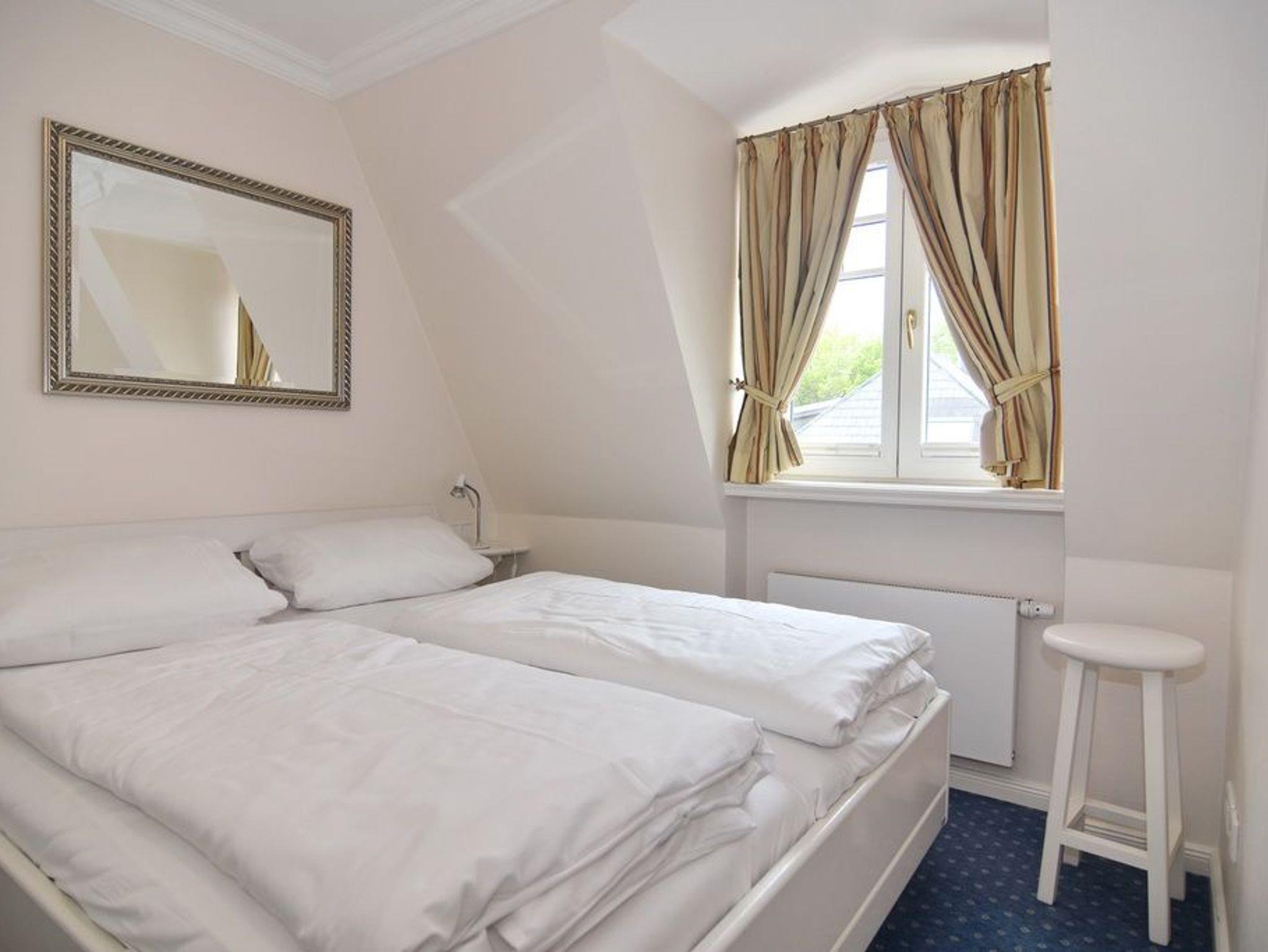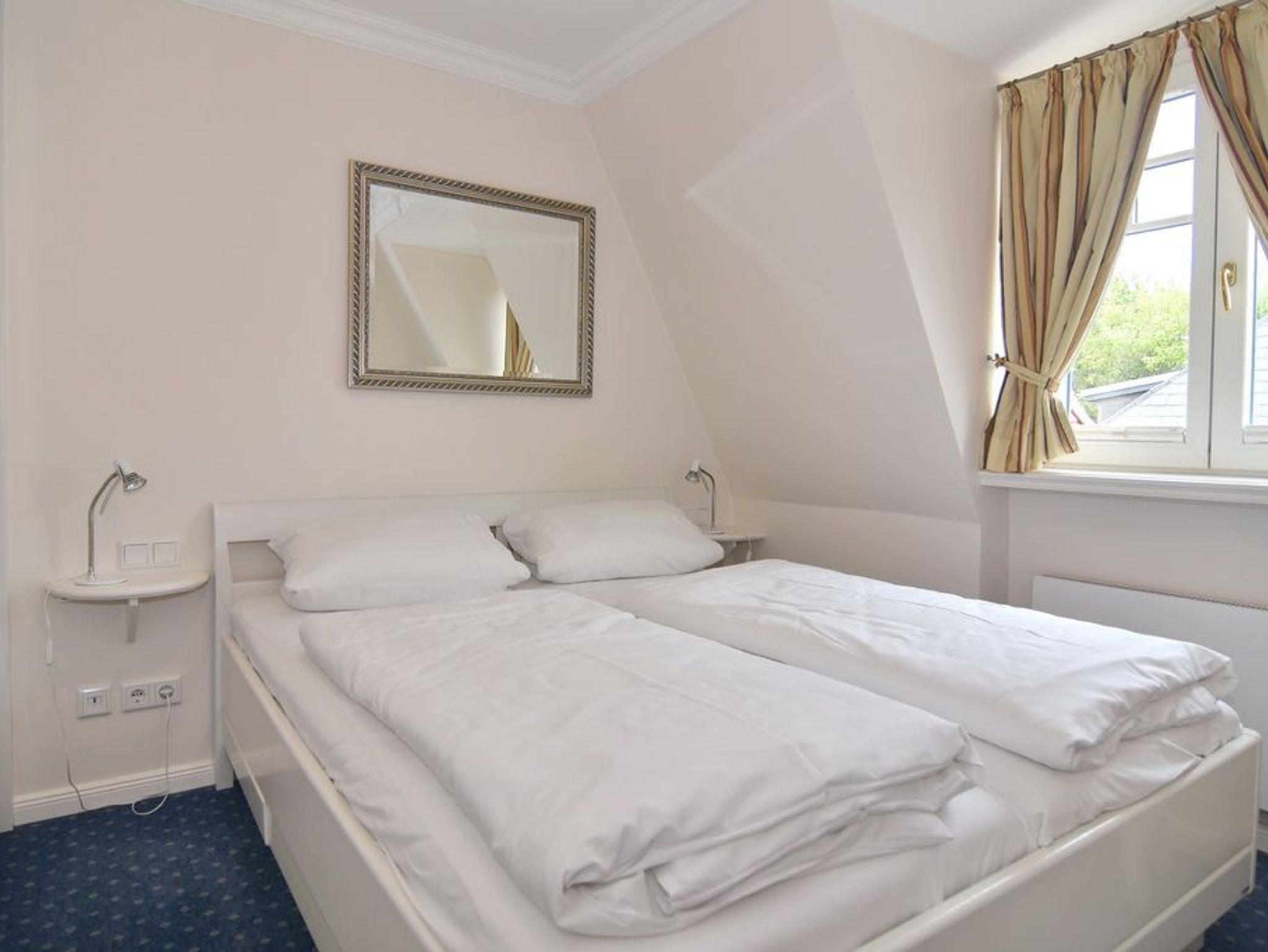 Exklusive 3-Zimmer-Ferienwohnung, Nichtraucher ca. 57 m². 1. OG.: Wohnraum mit Couch und 2 Sesseln, Essplatz, Kabel-TV, Stereo-Anlage, W-Lan, Südbalkon mit Balkonmöbeln, offene Küche mit Mikrowelle, Backofen und Geschirrspüler, Duschbad/WC. 1 Schlafzimmer mit Doppelbett (160x190) und Einbauschrank. DG: 1 Schlafzimmer mit Doppelbett, Einbauschrank und Gäste / WC mit Waschmaschine. PKW-Stellplatz am Haus. Tierhaltung verboten. Bettwäsche und Handtücher sind zur Anreise aufgezogen.