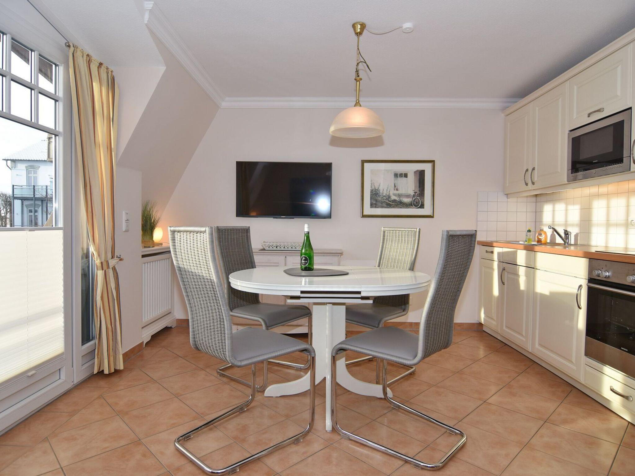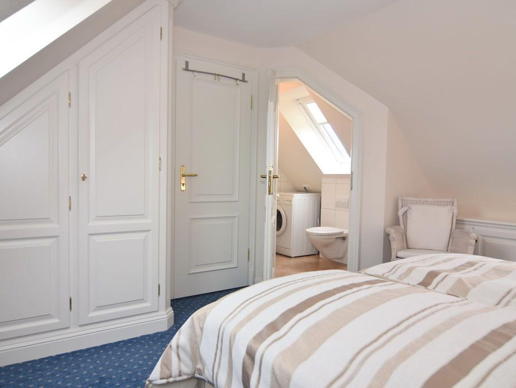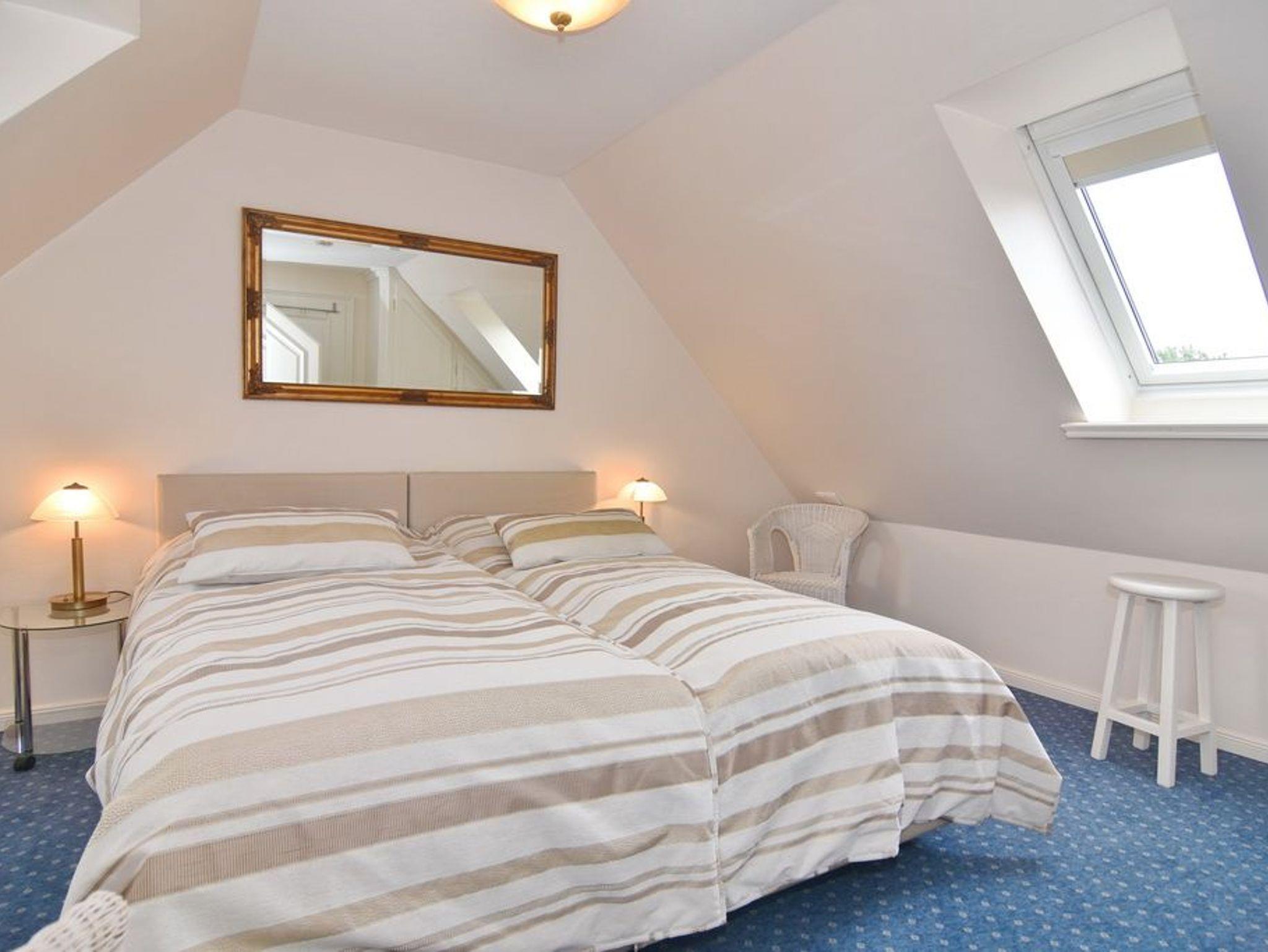 Exklusive 3-Zimmer-Ferienwohnung, Nichtraucher ca. 57 m². 1. OG.: Wohnraum mit Couch und 2 Sesseln, Essplatz, Kabel-TV, Stereo-Anlage, W-Lan, Südbalkon mit Balkonmöbeln, offene Küche mit Mikrowelle, Backofen und Geschirrspüler, Duschbad/WC. 1 Schlafzimmer mit Doppelbett (160x190) und Einbauschrank. DG: 1 Schlafzimmer mit Doppelbett, Einbauschrank und Gäste / WC mit Waschmaschine. PKW-Stellplatz am Haus. Tierhaltung verboten. Bettwäsche und Handtücher sind zur Anreise aufgezogen.