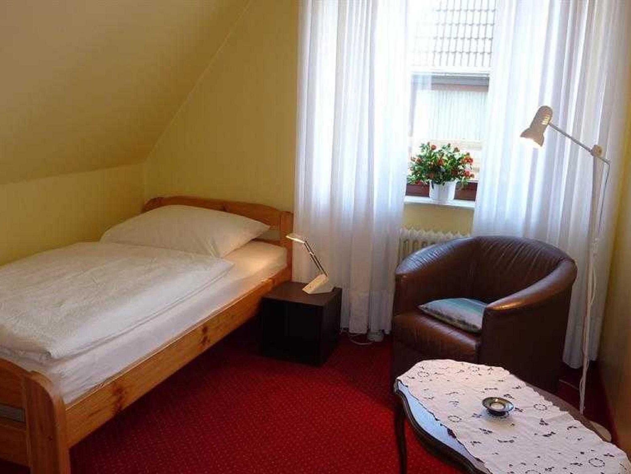 Das zweite Schlafzimmer ist eingerichtet mit einem Einzelbett (90x200), Nachttisch mit Lampe, Kleiderschrank und einer Leseecke mit Stehlampe, Ledersessel und Beistelltisch.